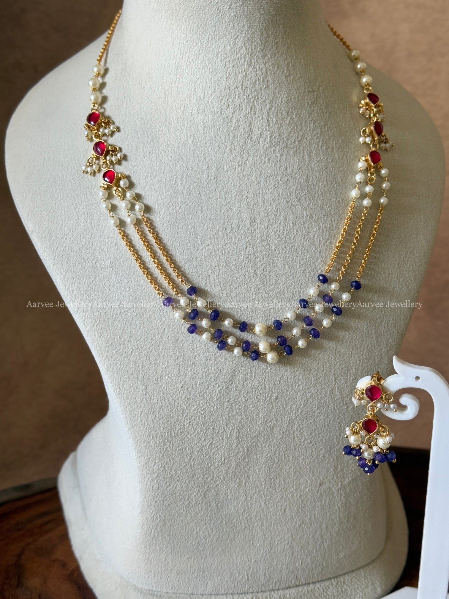 MINIMAL POLKI KUNDAN LAYERED CHAIN SET WITH RUBY STONE & PURPLE BEADS
