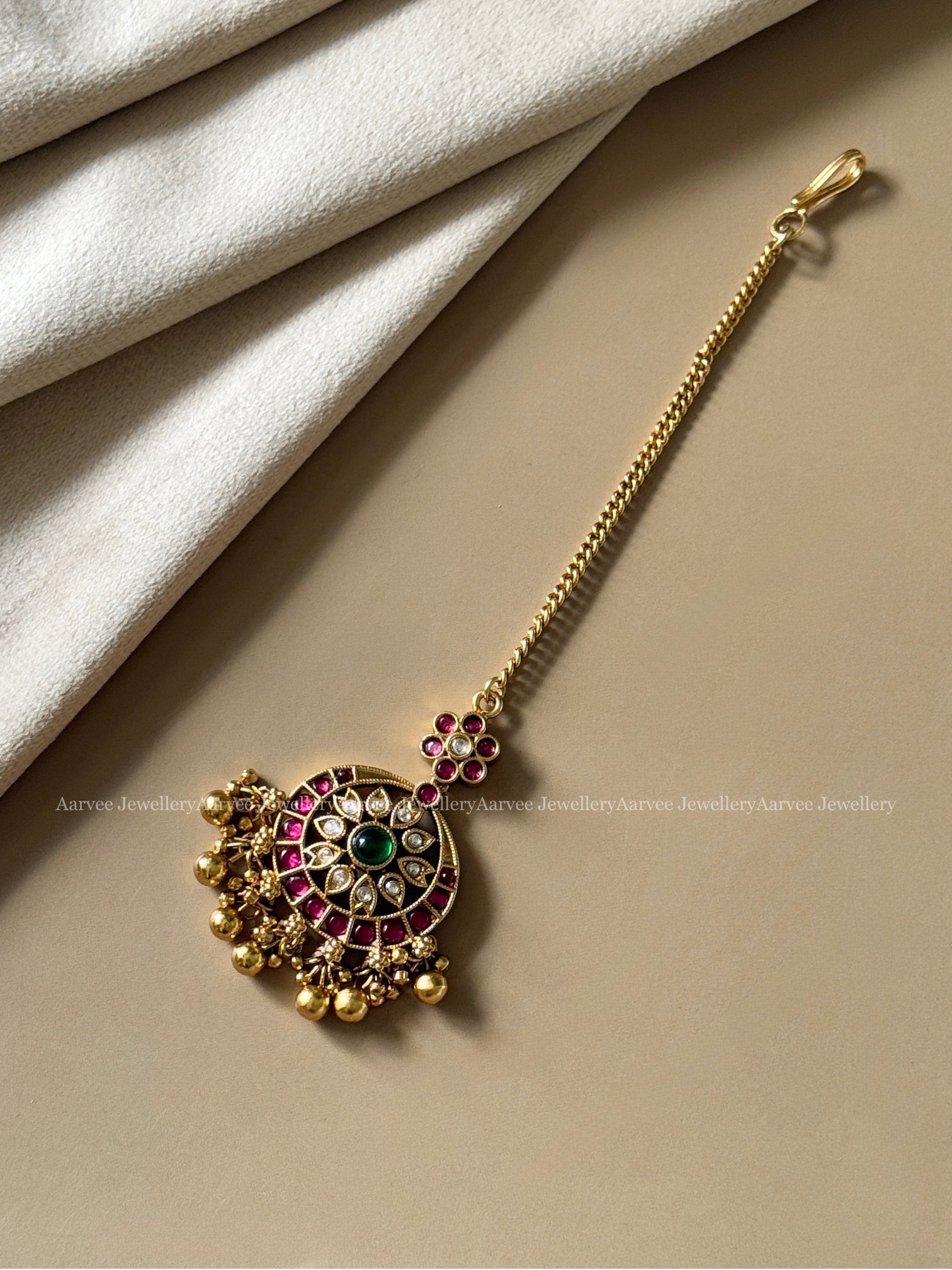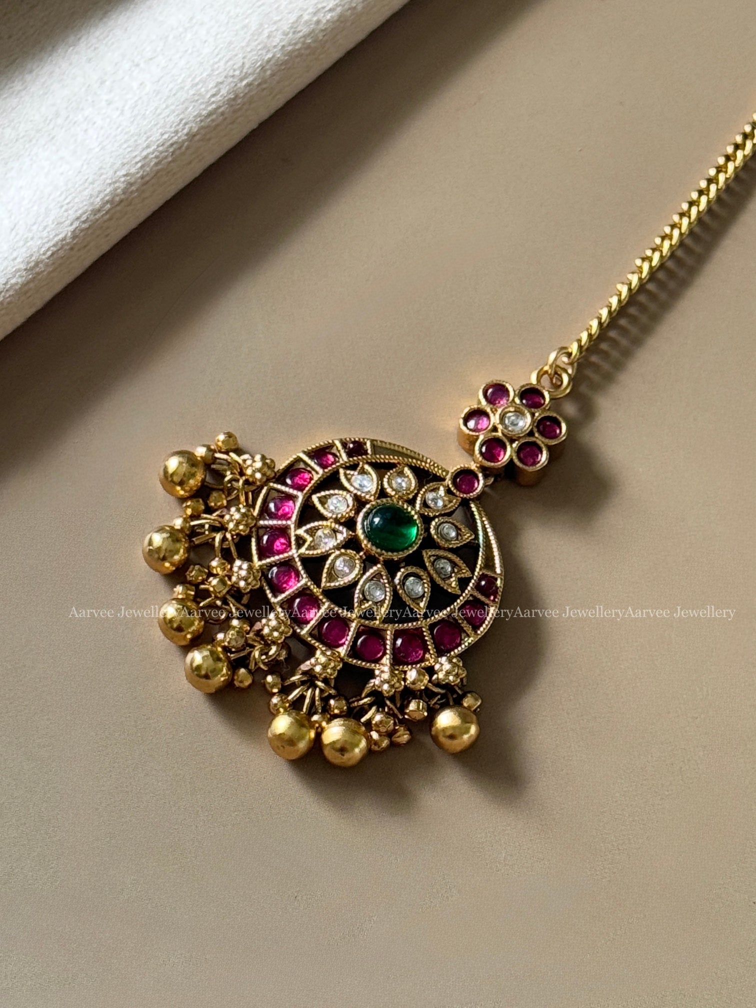 Antique Finish Maangtikka Embellished with Colorful Kemp Stones and Gold Beads