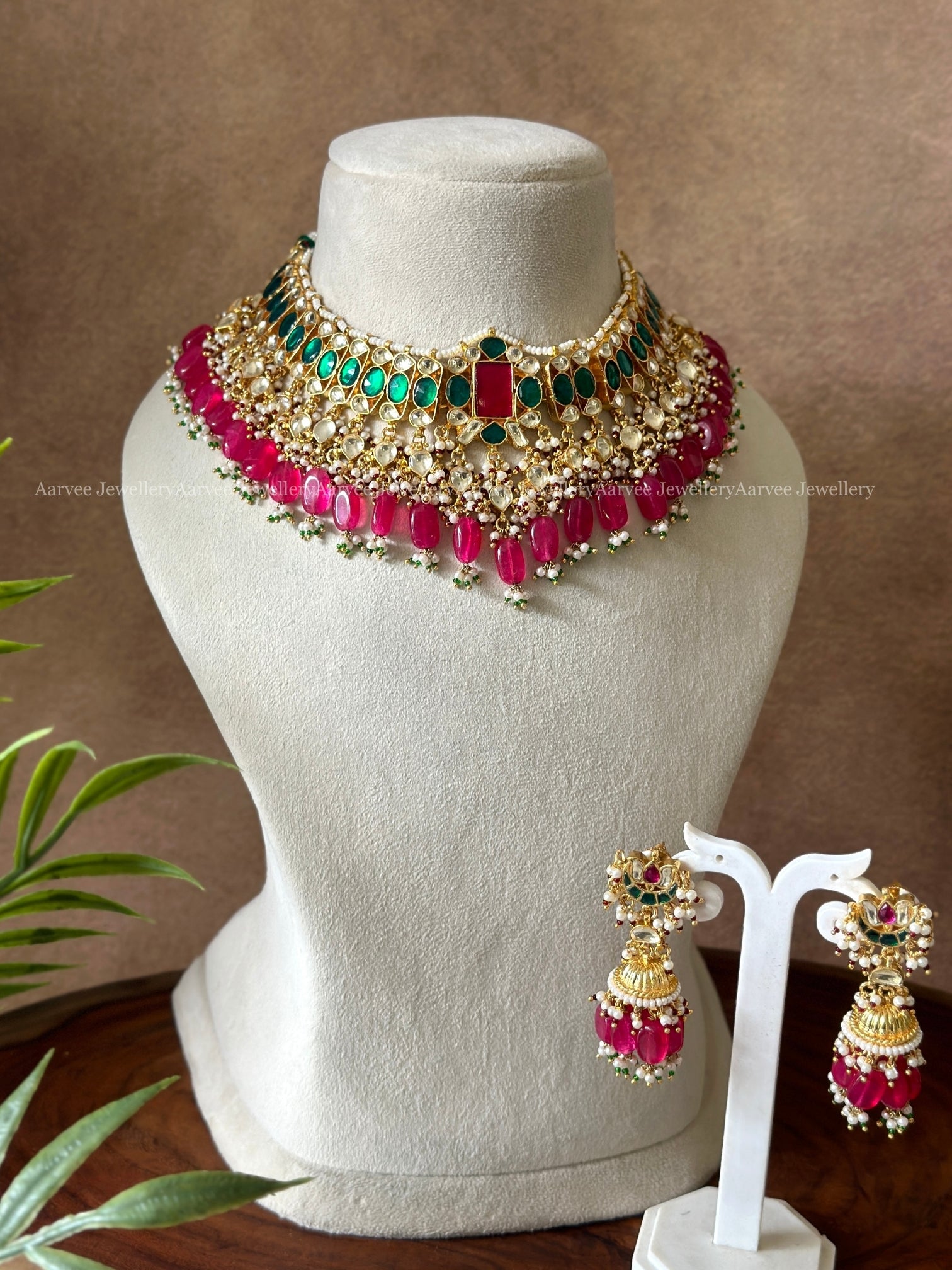 Sophisticated Polki Kundan necklace featuring a harmonious blend of stones in green, white, and ruby red