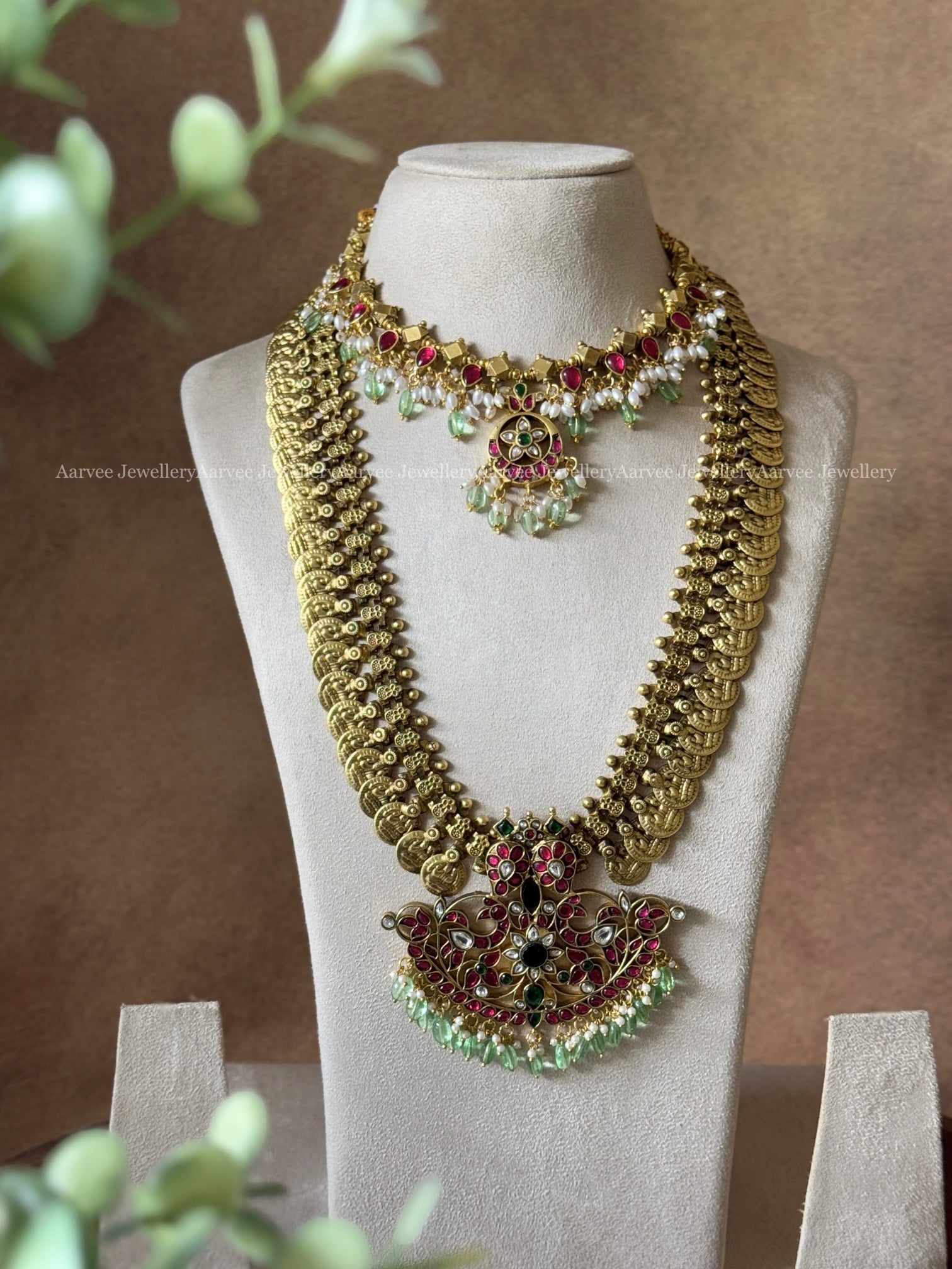 COMBO - JADAU KUNDAN GOLD BALL NECKLACE WITH MANGO PENDANT COIN MID LENGTH CHAIN WITH PASTEL BEADS