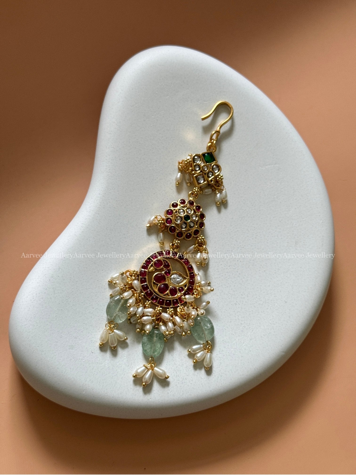Elegant Peacock Motif Tikka Featuring Kemp Stones and Delicate Pastel Beads
