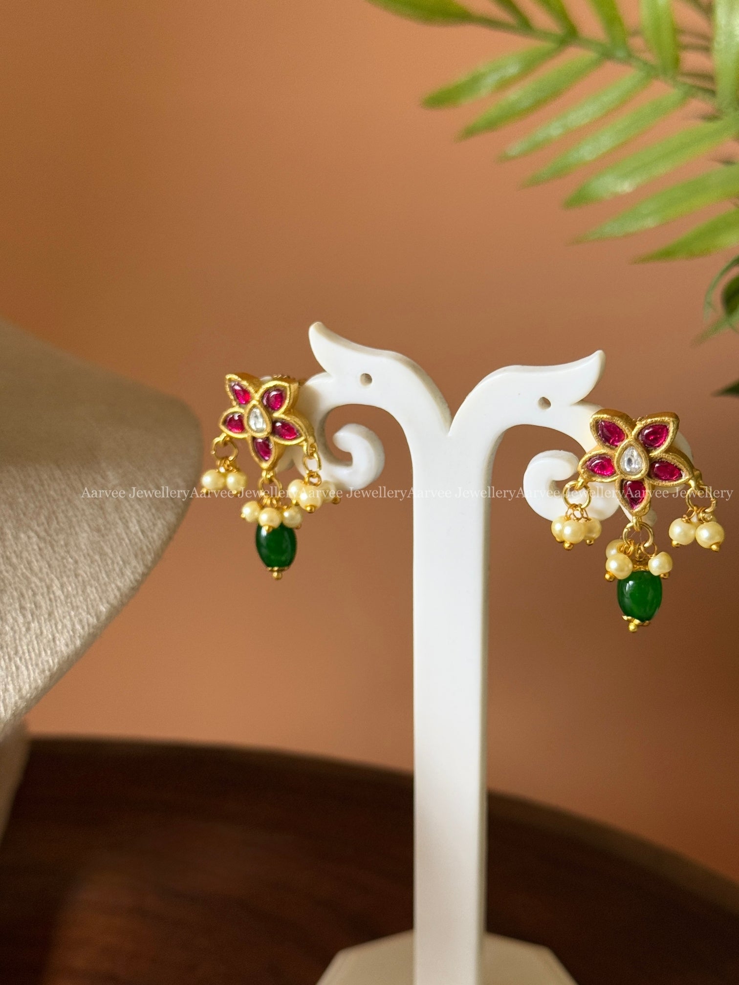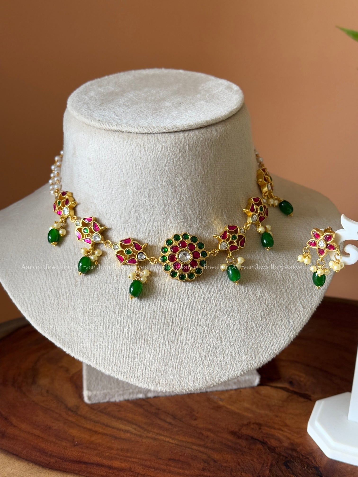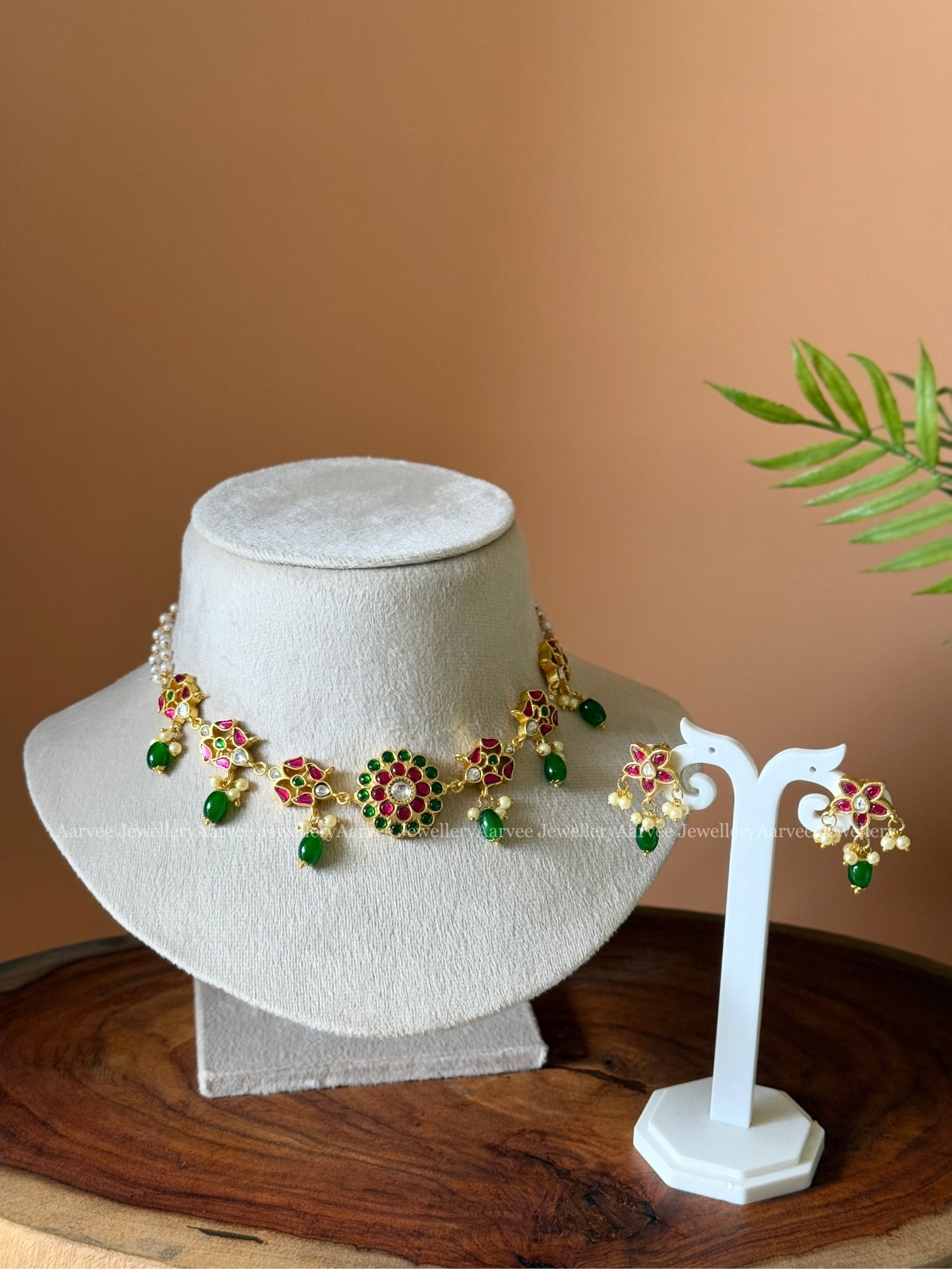 PEARL LINE JADAU KUNDAN CHOKER SET WITH ROUND PENDANT AND GREEN BEAD DROPS