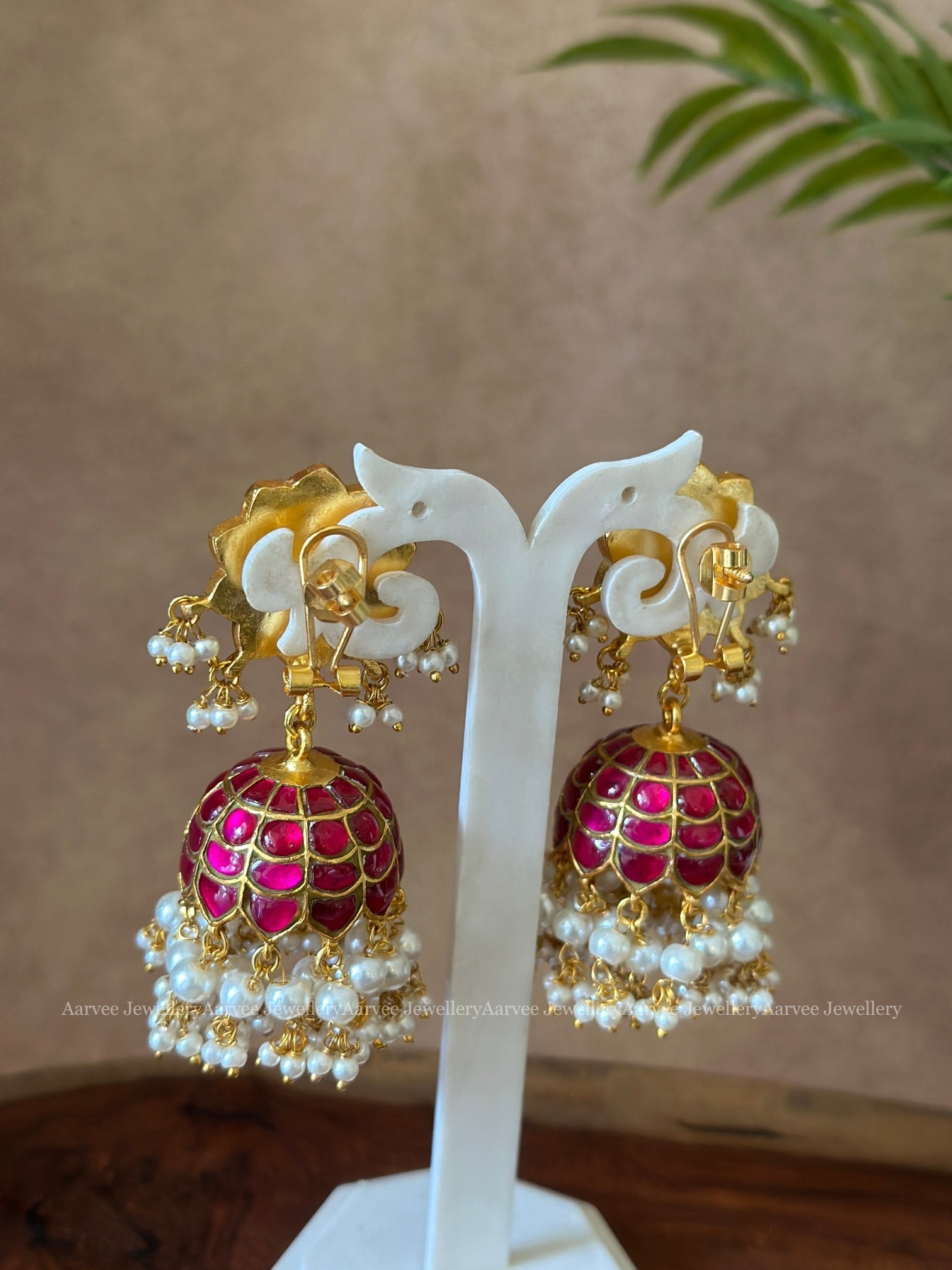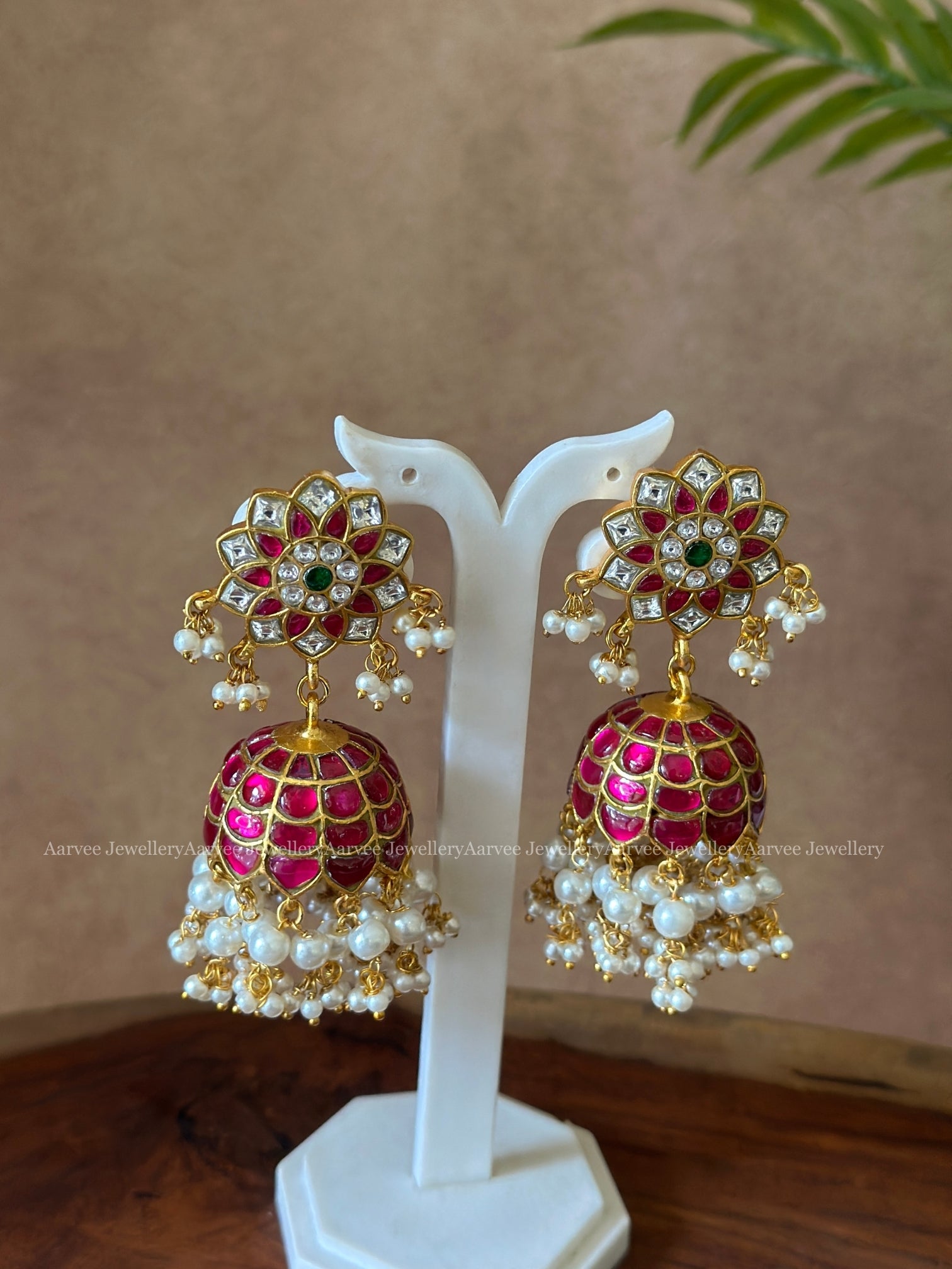 PINK COLOR JADAU KUNDAN FLORAL JHUMKI WITH PEARLS