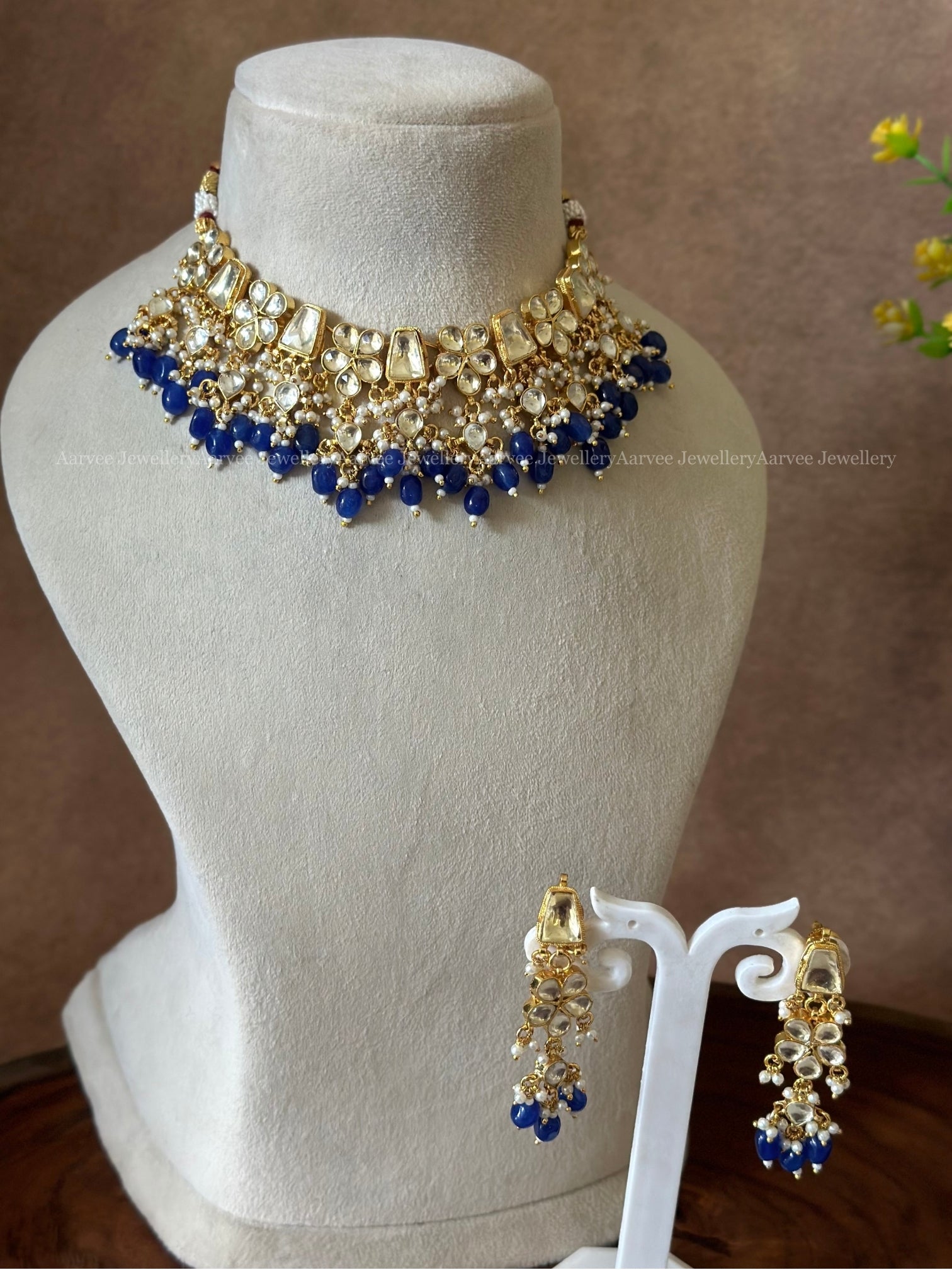 Charming Polki Kundan Choker Set featuring a mix of White Stones and Blue Beads for a striking look