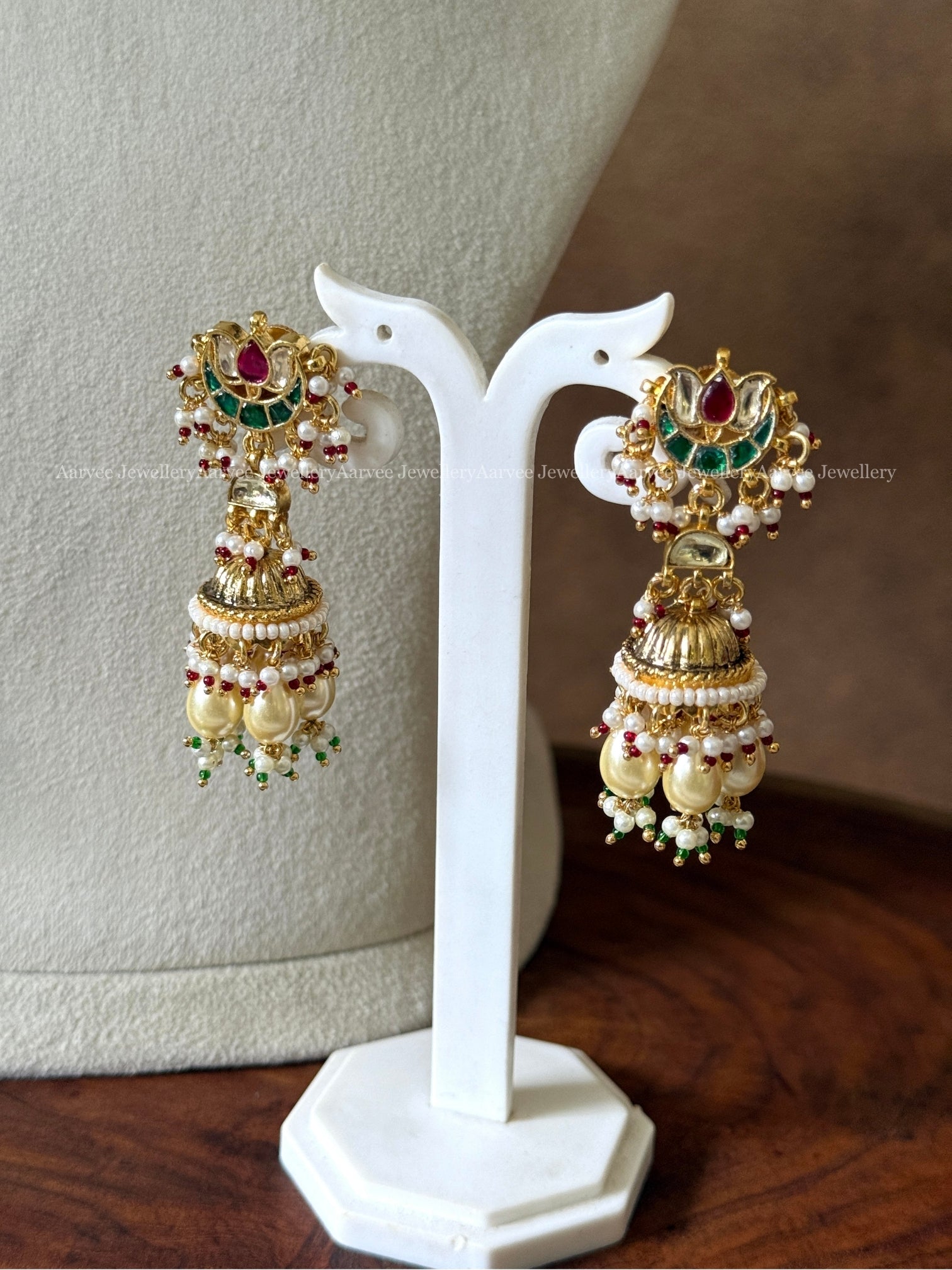 Elegant bridal choker set in polki kundan with green gemstones and dangling pearl beads