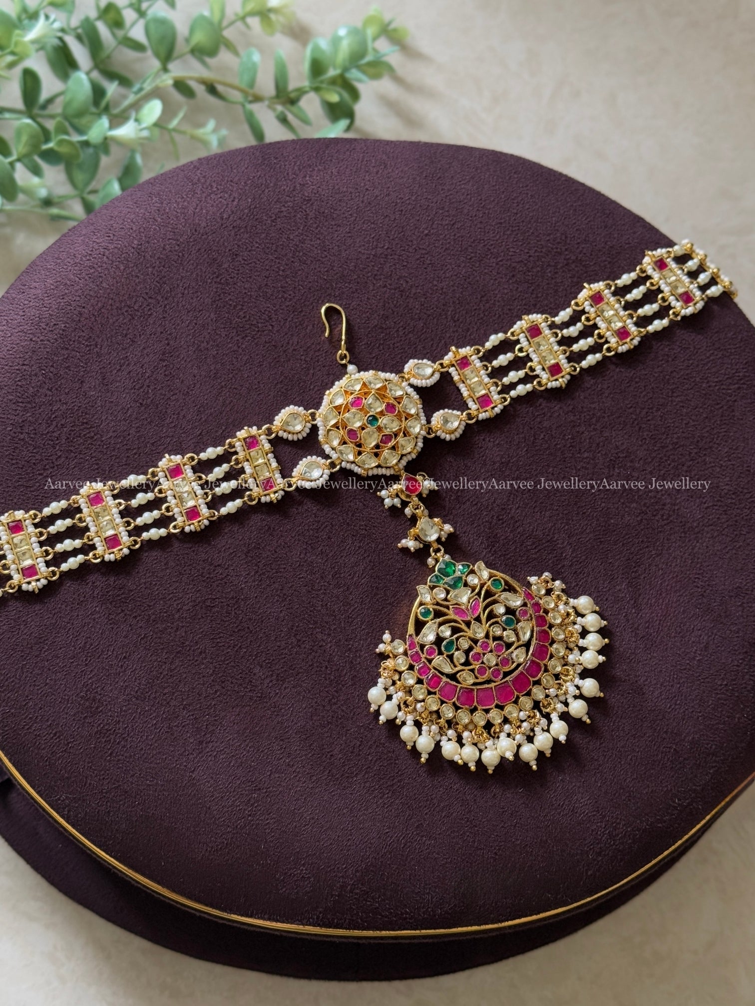 Polki Kundan Mathapatti with White & Pink Stone Pendant Adorned with Pearls