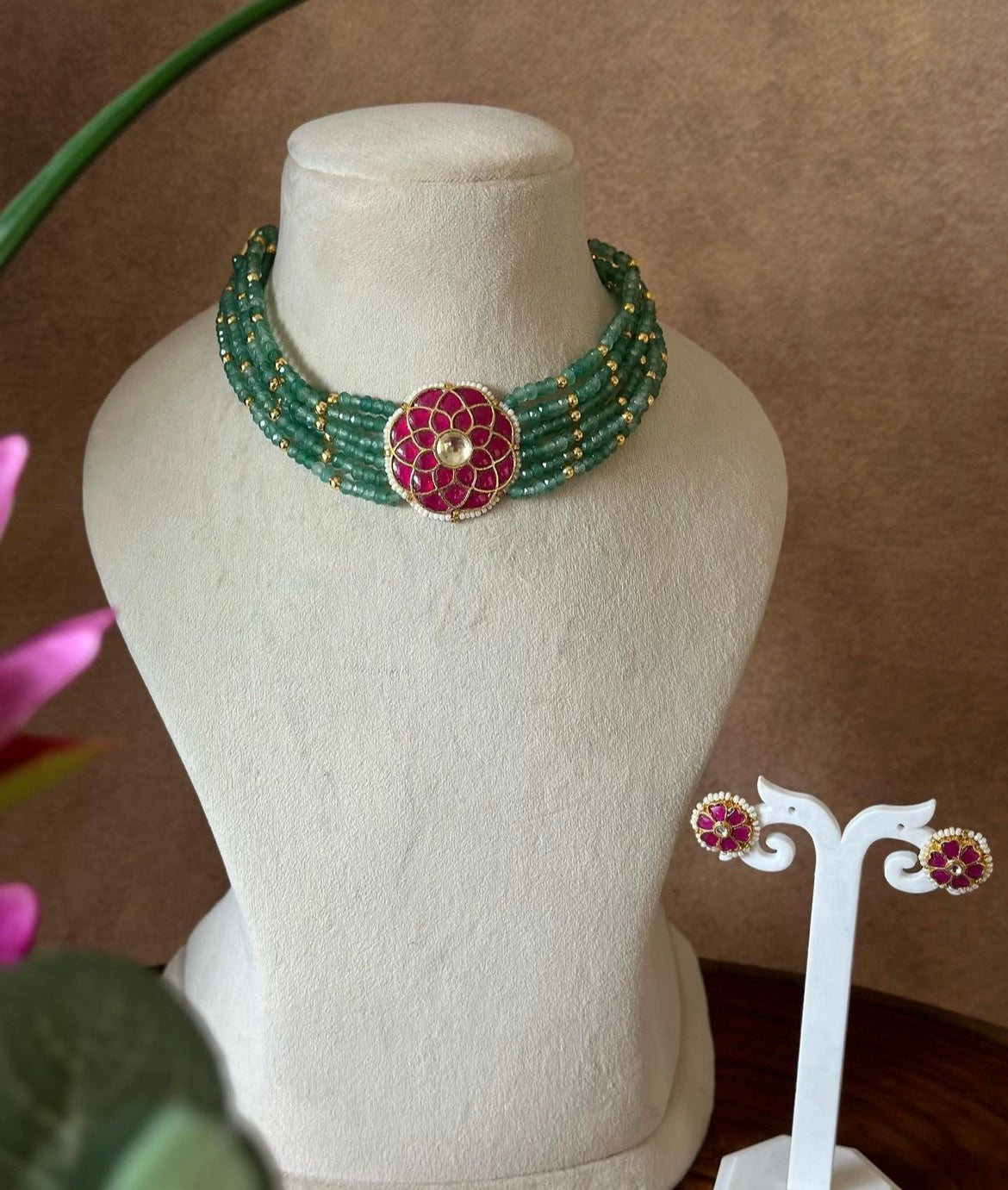POLKI KUNDAN PASTEL BEADED CHOKER SET WITH PINK FLORAL PENDANT