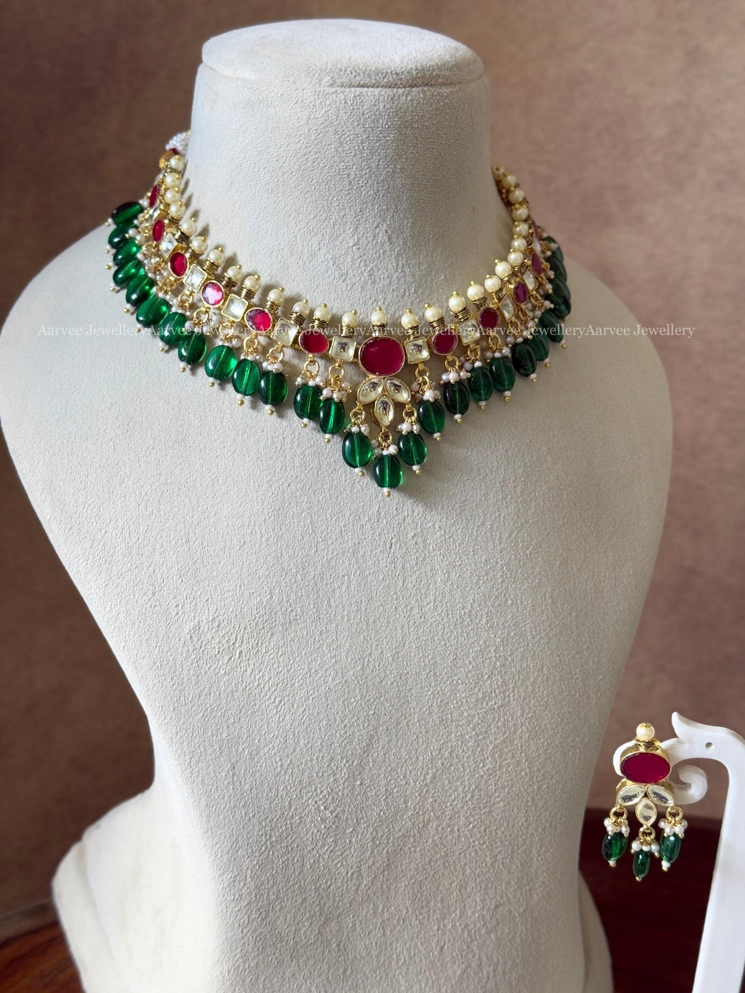 Intricate Polki Kundan Necklace Featuring Ruby Stones Paired with Dark Green Beads