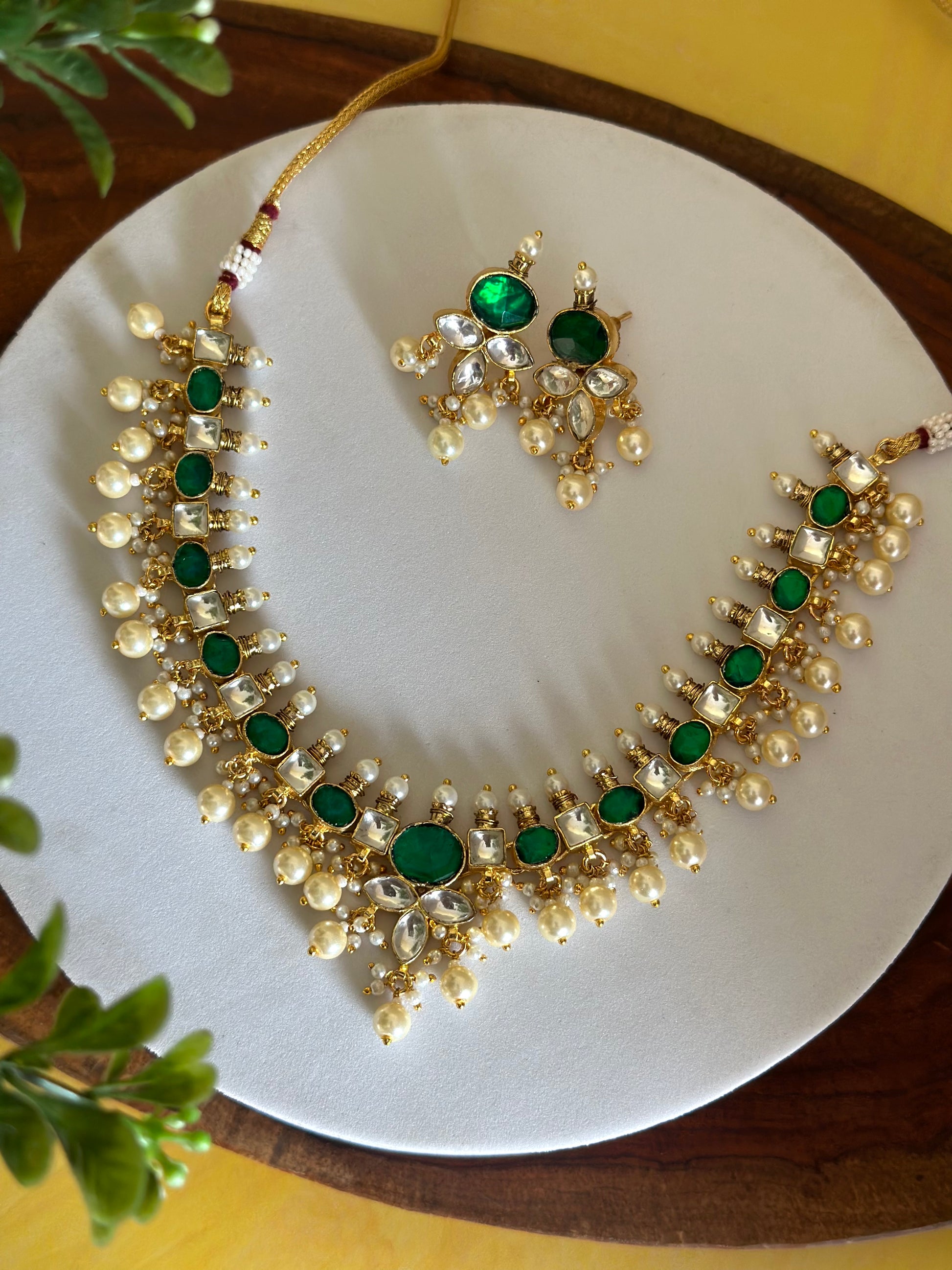 POLKI KUNDAN NECKLACE SET | GREEN STONE WITH PEARL DROP