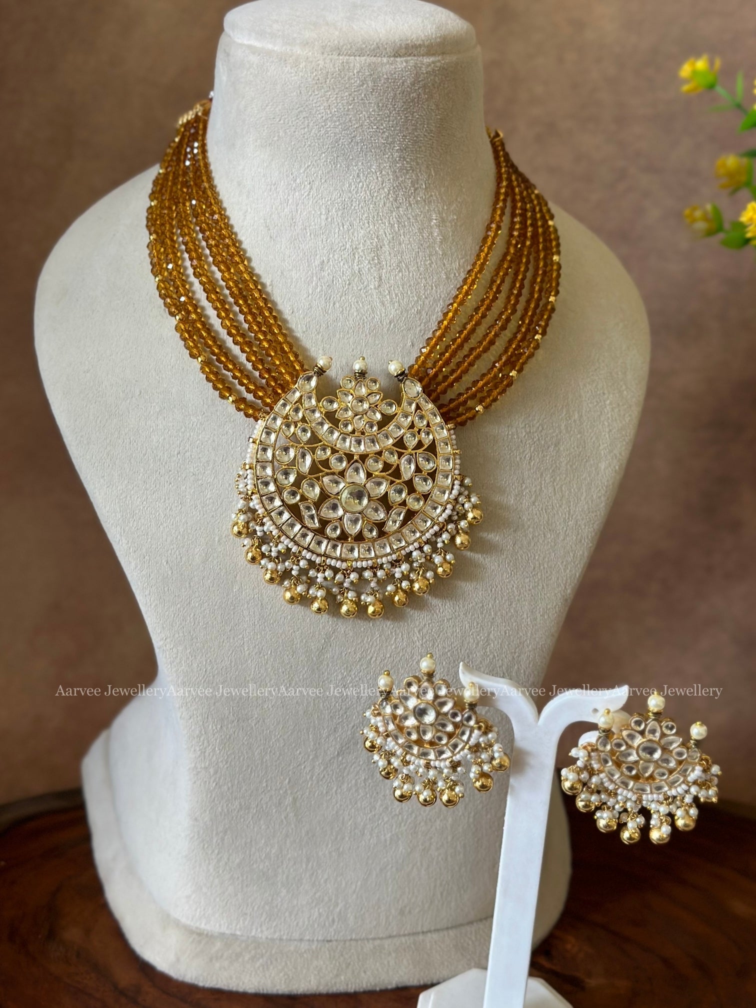 Traditional Polki Kundan ensemble accented with mustard bead layers and a classic Kundan pendant