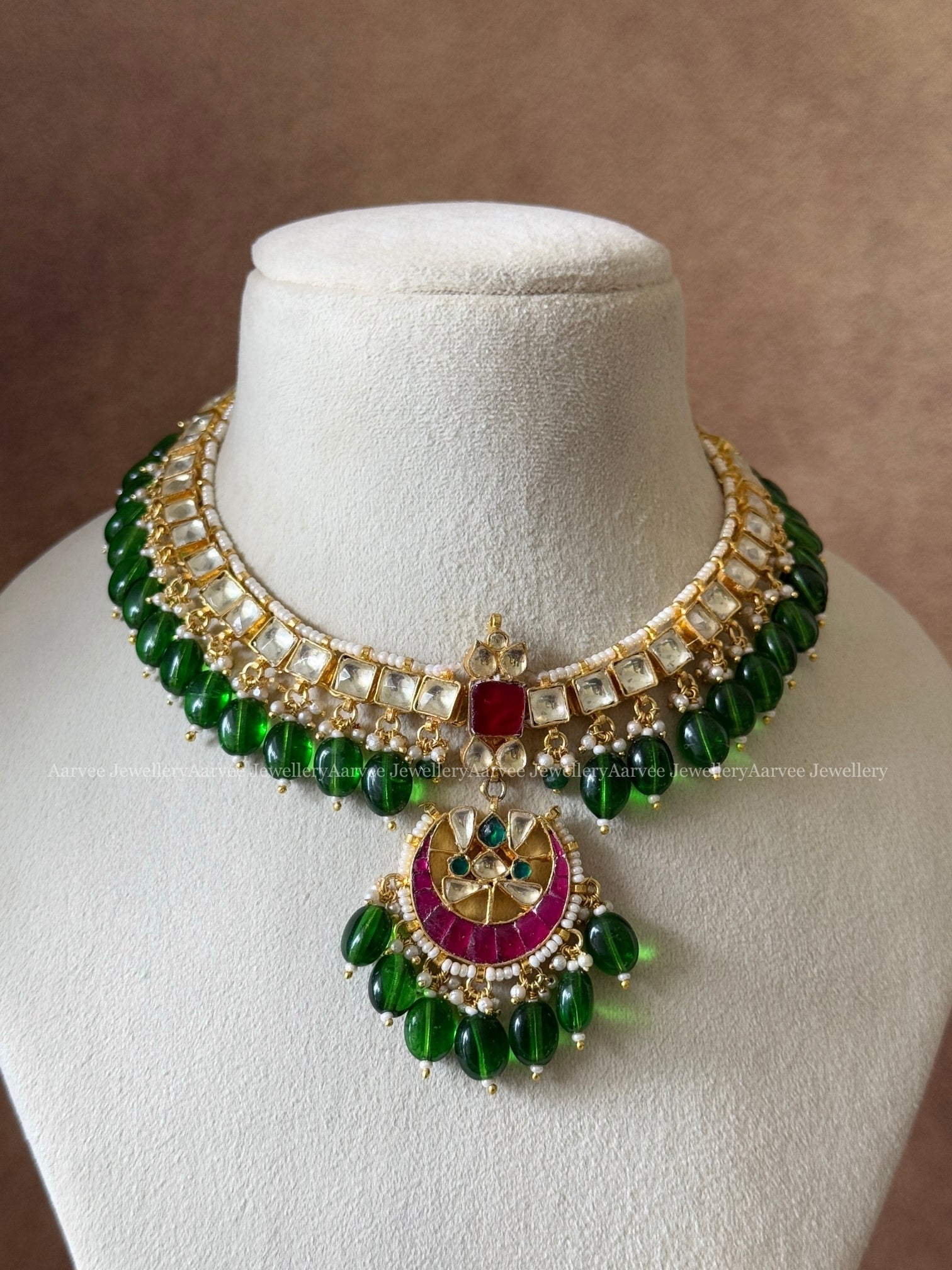 POLKI KUNDAN WHITE & RUBY STONES NECKALCE SET WITH CHAND PENDANT WITH GREEN BEADS