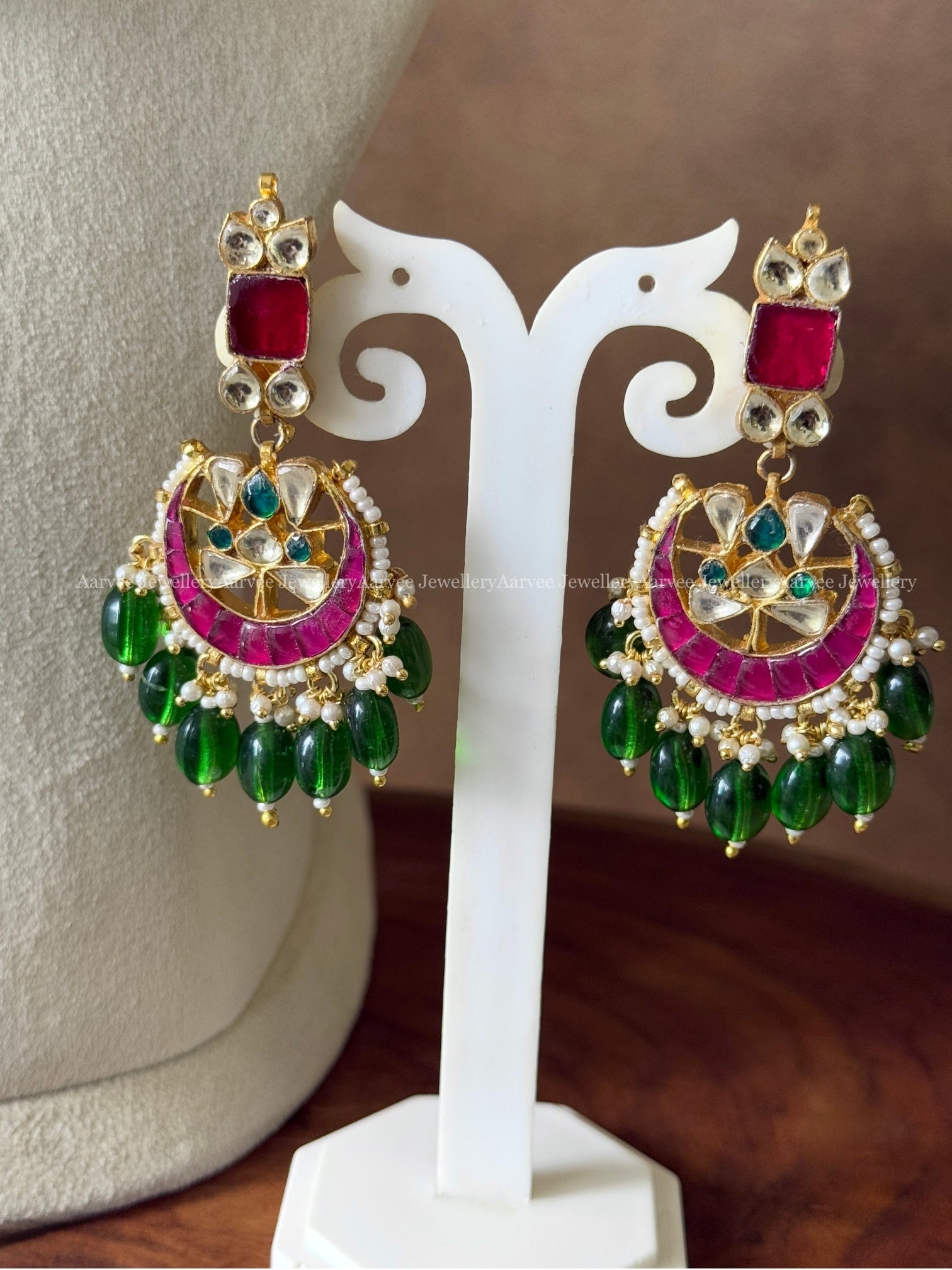 Elegant Polki Kundan set with white and ruby stones, highlighted by a crescent-shaped pendant and green beads