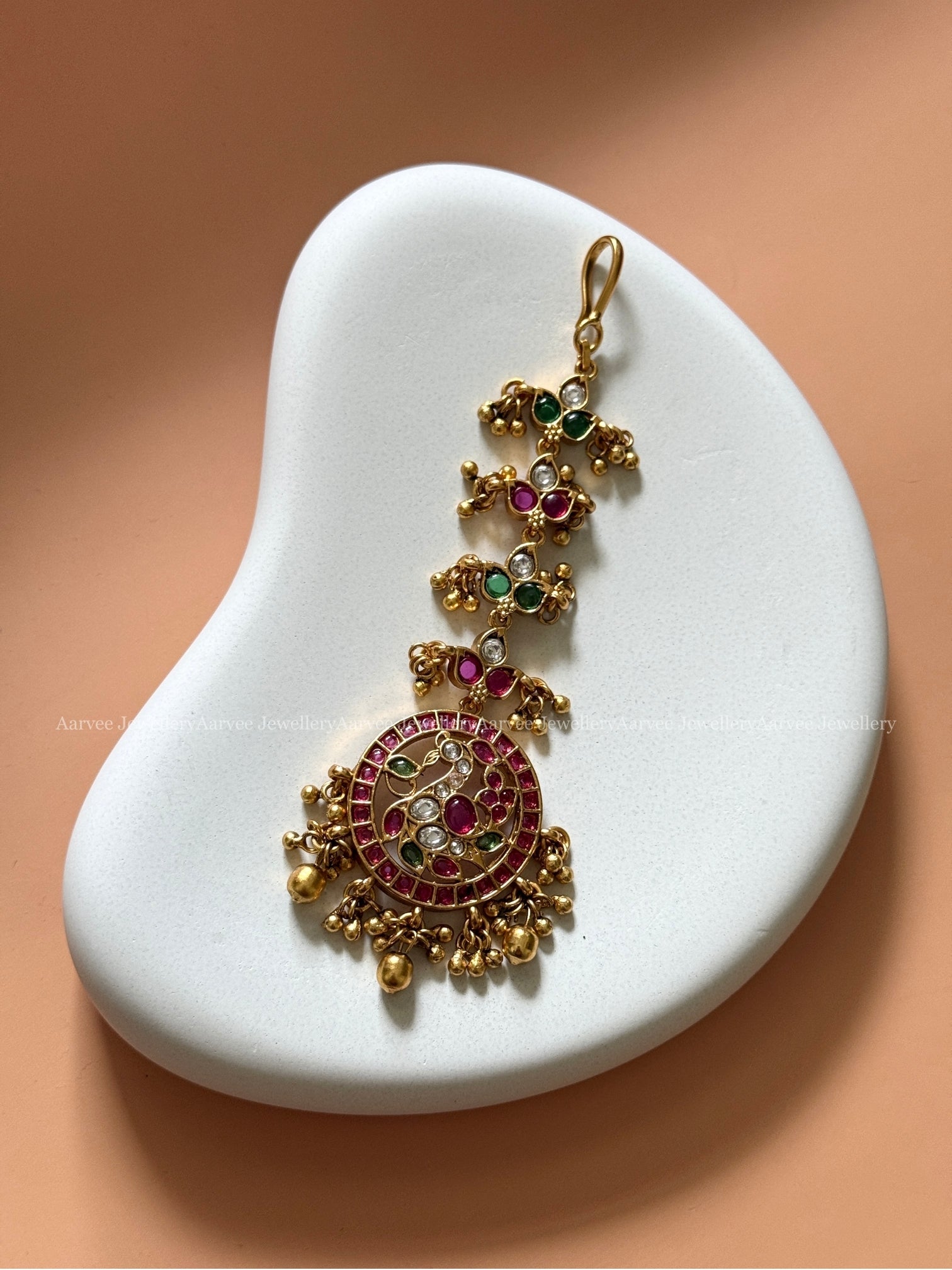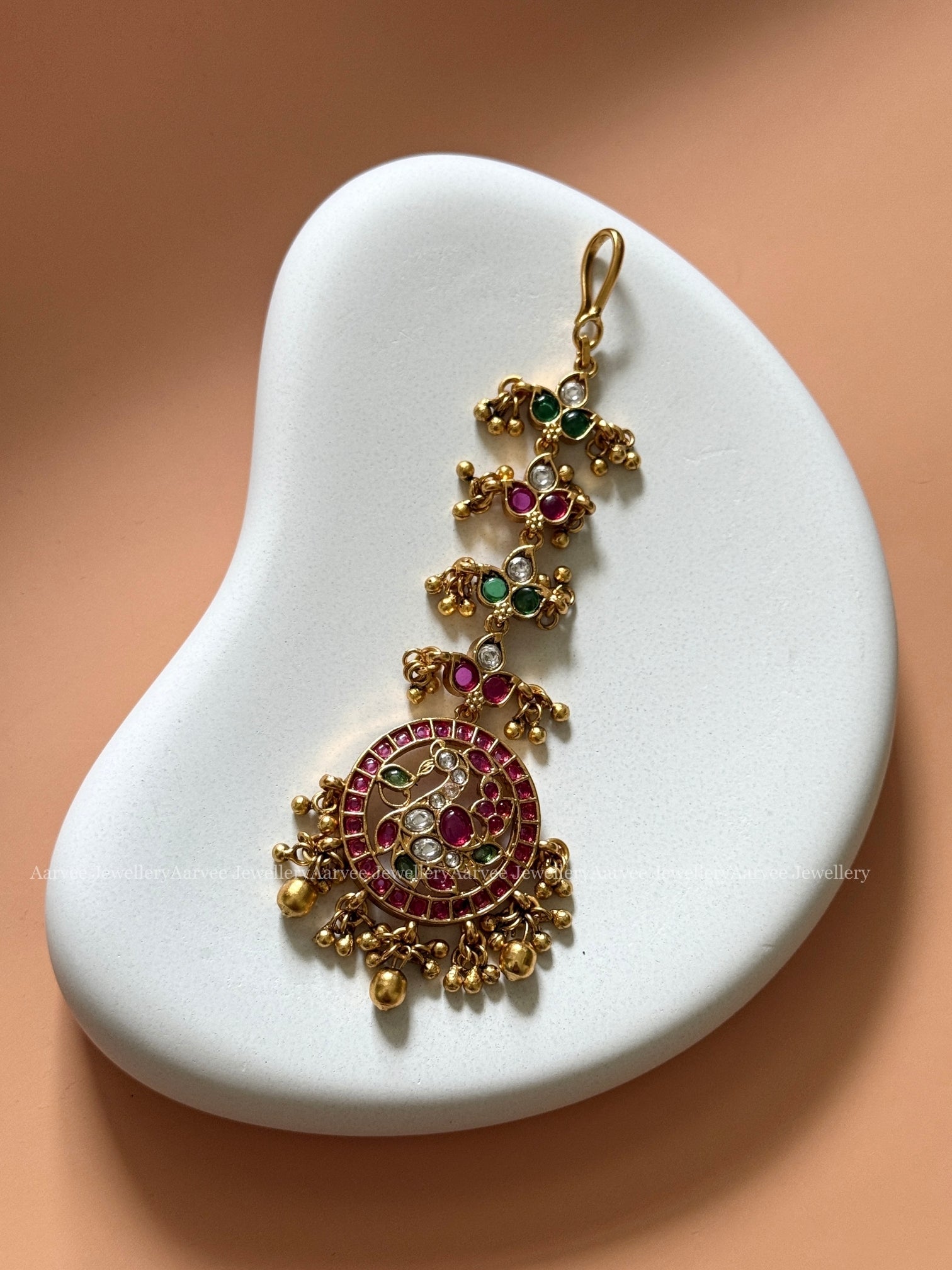 Exclusive Premium Kemp Tikka Featuring Peacock Pendant, Ruby/Green Stones, and Golden Beads