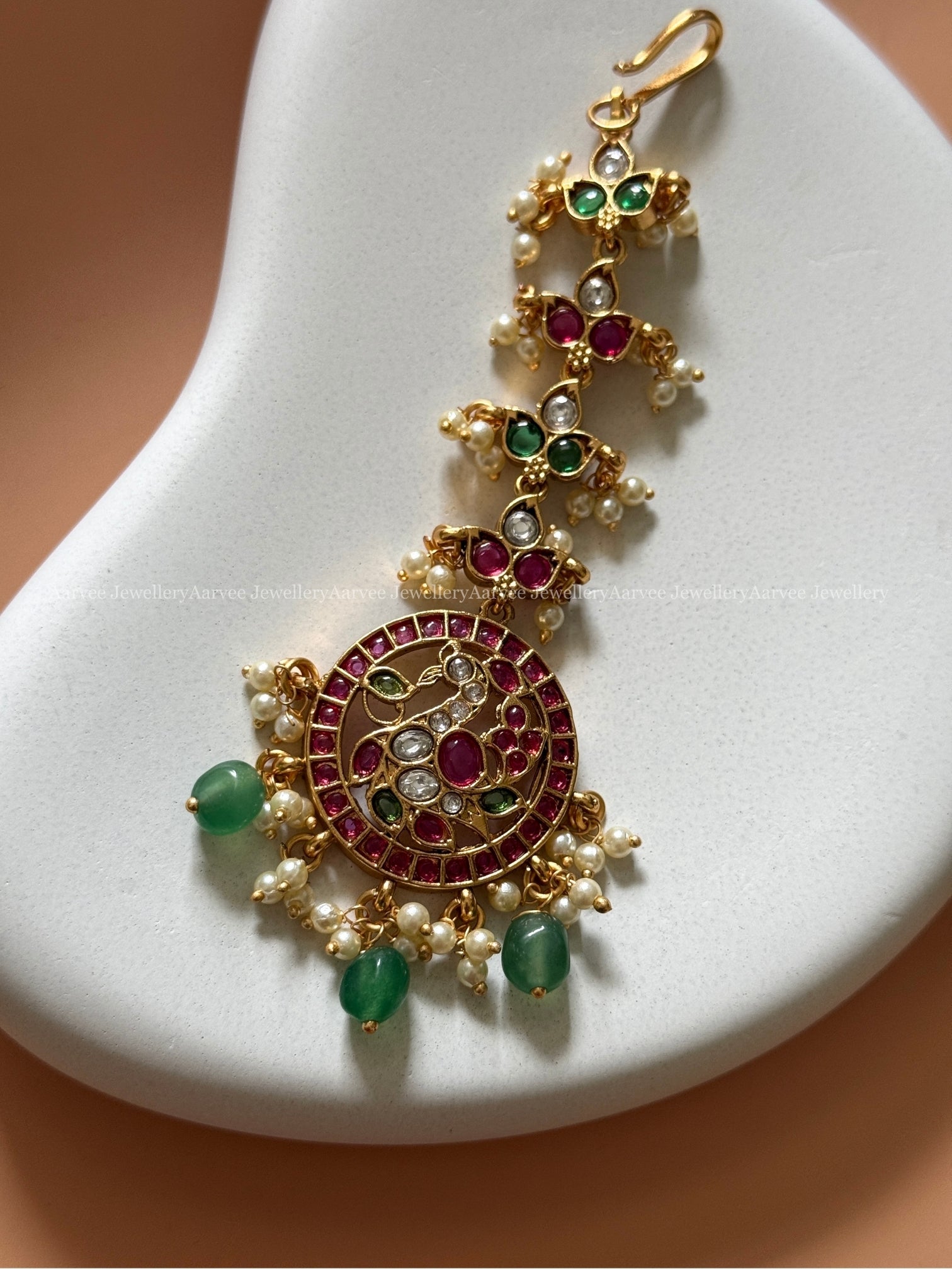 PREMIUM KEMP RUBY / GREEN STONES TIKKA WITH PEACOCK PENDANT - PEARL & PASTEL BEADS