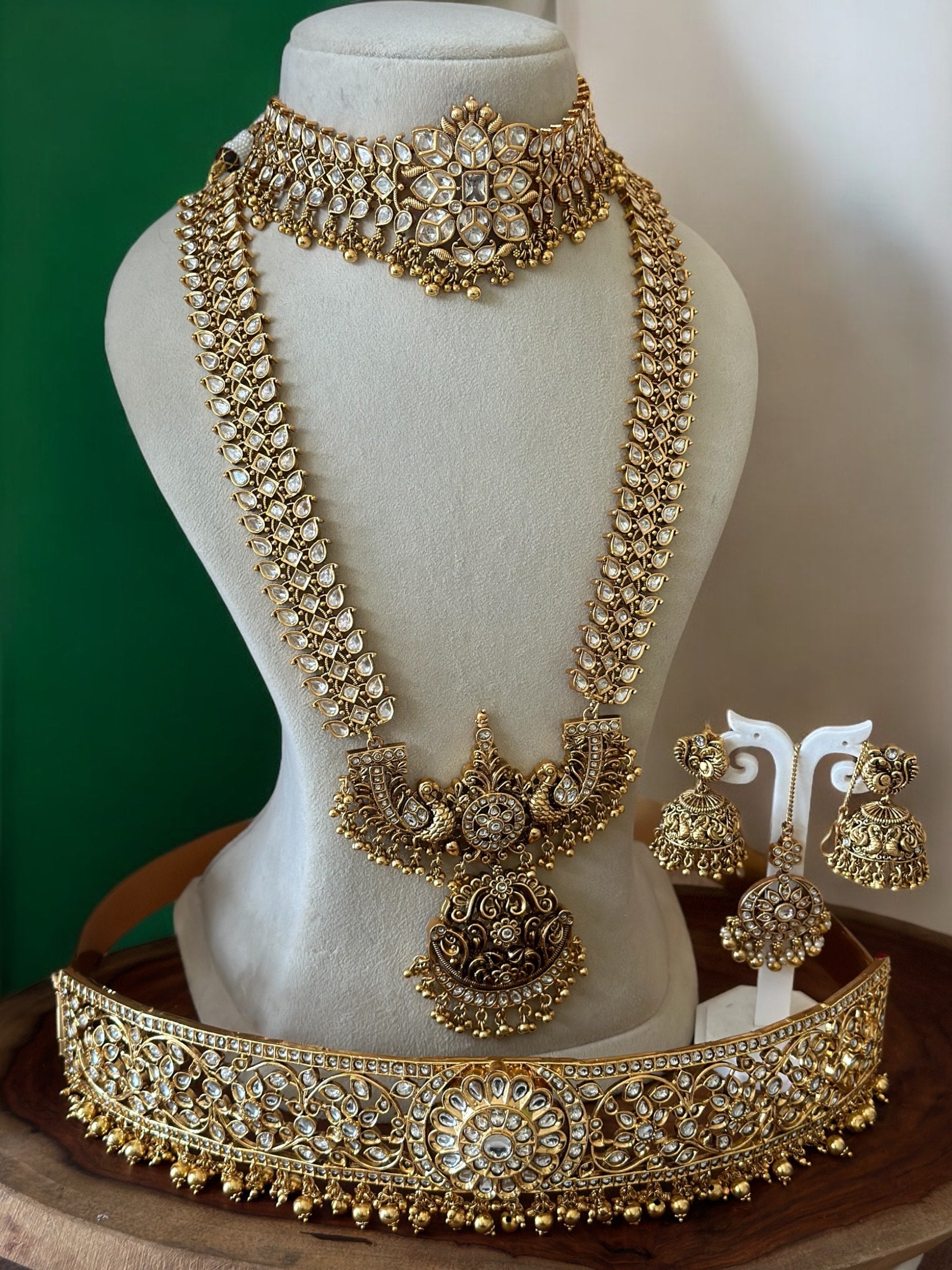 The set Contains : A choker, Haram, waist belt , one Pair of earrings & Tikka.
