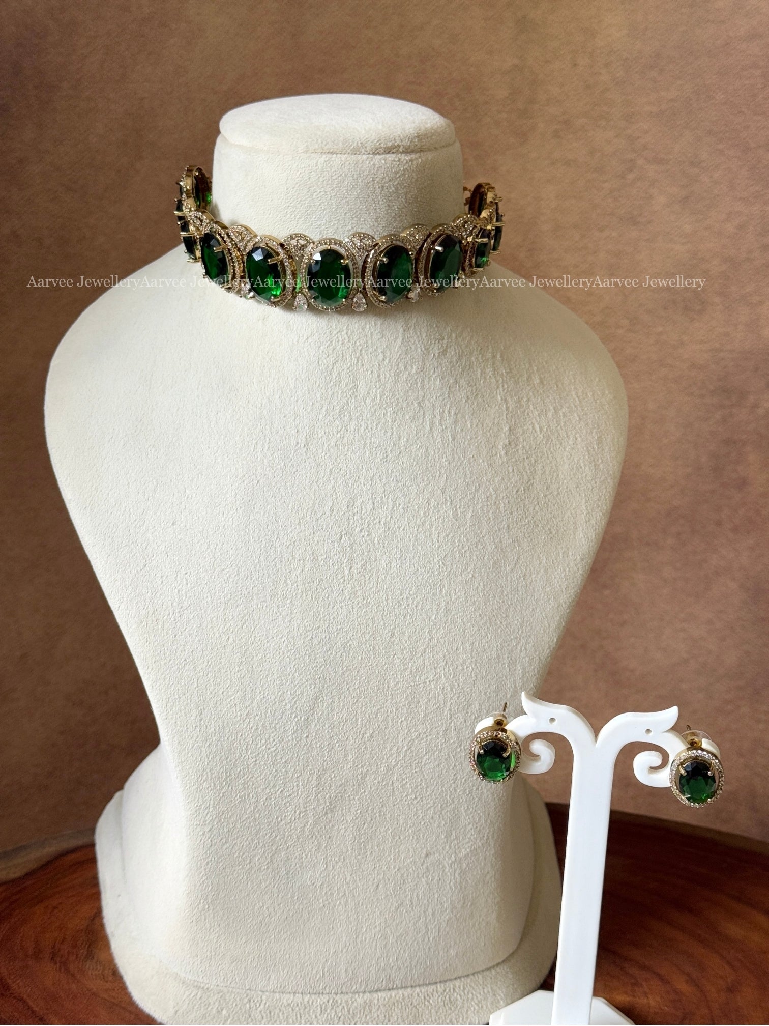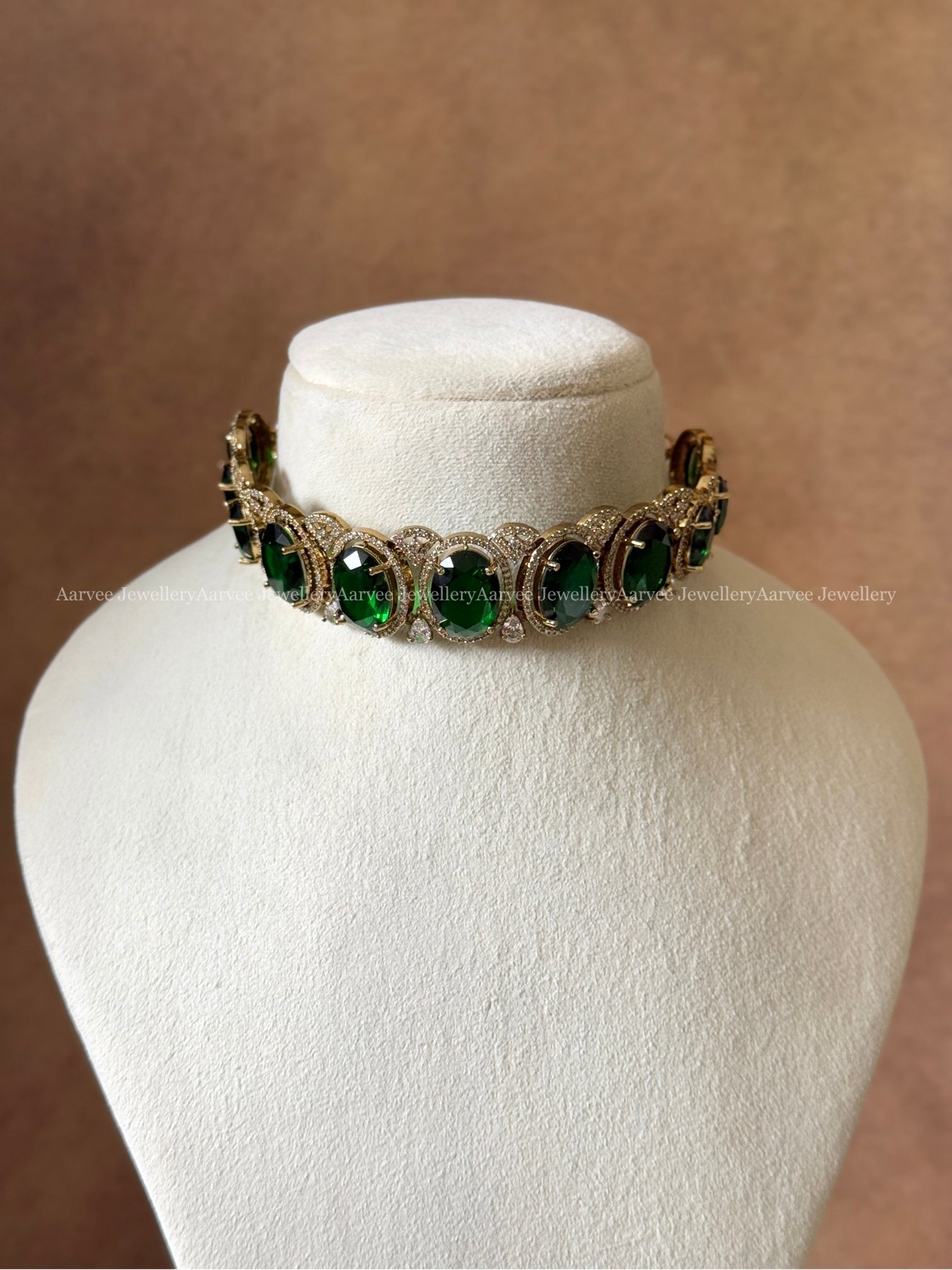 Green Gemstone Victorian Choker Set – Highneck Design with Round Cut