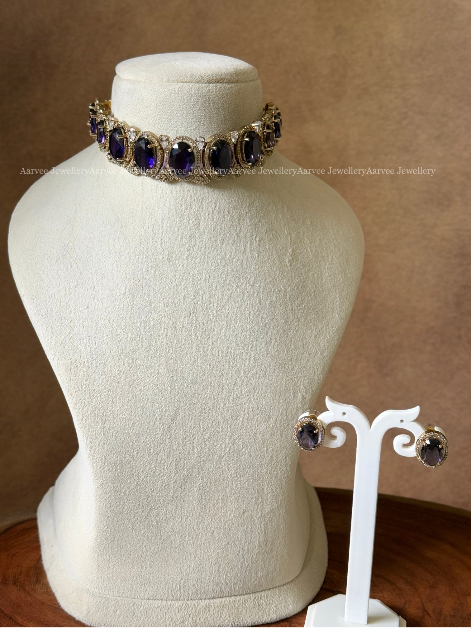 ROUND CUT PURPLE STONE VICTORIAN HIGHNECK CHOKER SET
