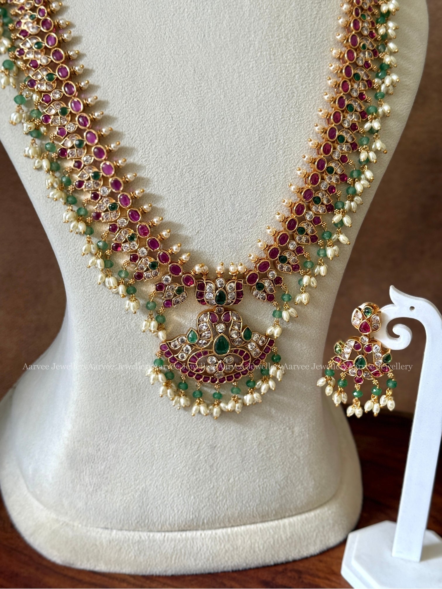 RUBY STONE FLORAL HARAM SET WITH TINY PASTEL GREEN BEADS & RICE PEARL