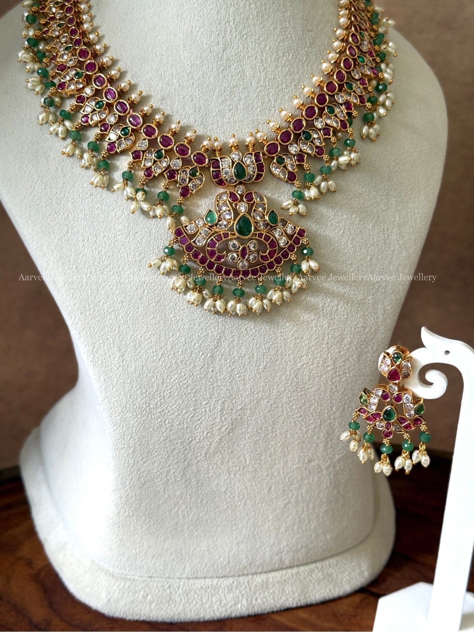 RUBY STONE FLORAL NECKLACE SET WITH TINY PASTEL GREEN BEADS & RICE PEARL