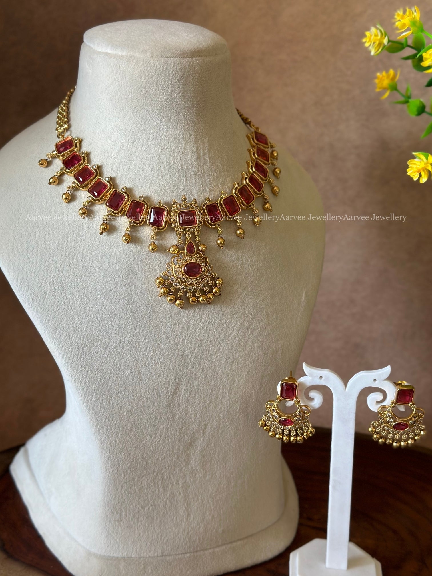 Classic ruby stones necklace set, complemented by shimmering gold beads