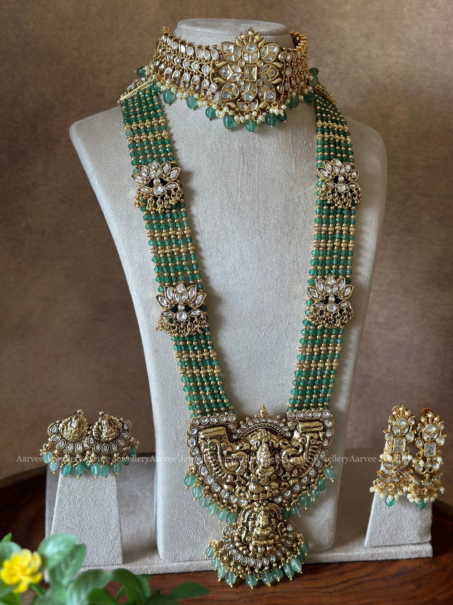 SEMI BRIDAL SET | PASTEL BEADED HARAM WITH LAKSHMI PENDANT PAIRED WITH A KUNDAN CHOKER WITH PASTEL BEADS