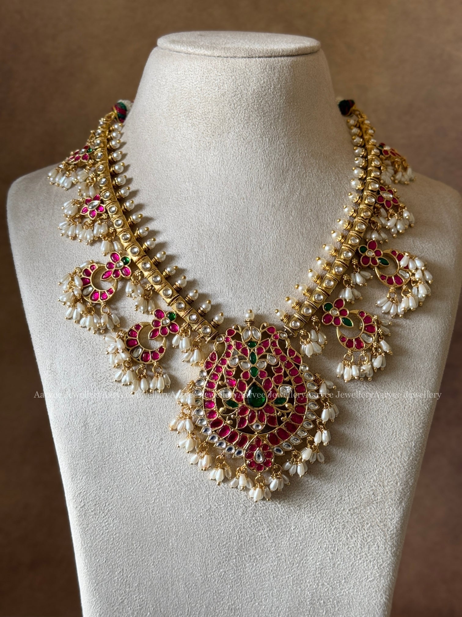 SEMI PRECIOUS KEMP STONES GUTTA PUSALU NECKLACE SET WITH PEACOCK PENDANT & RICE PEARLS | GOLD FINISH