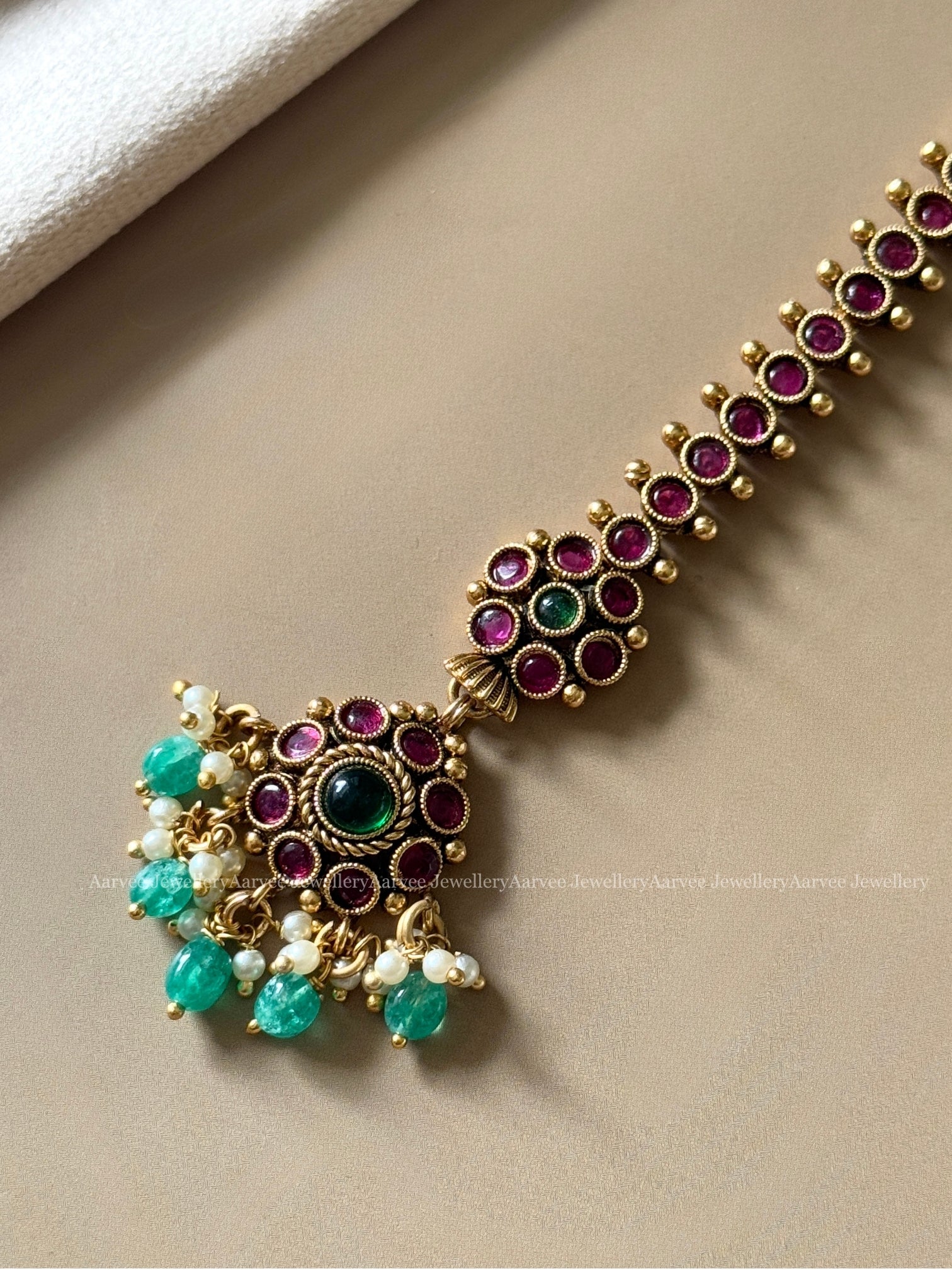 Graceful Kemp-Style Tikka with Ruby Stones and Light Pastel Bead Detailing