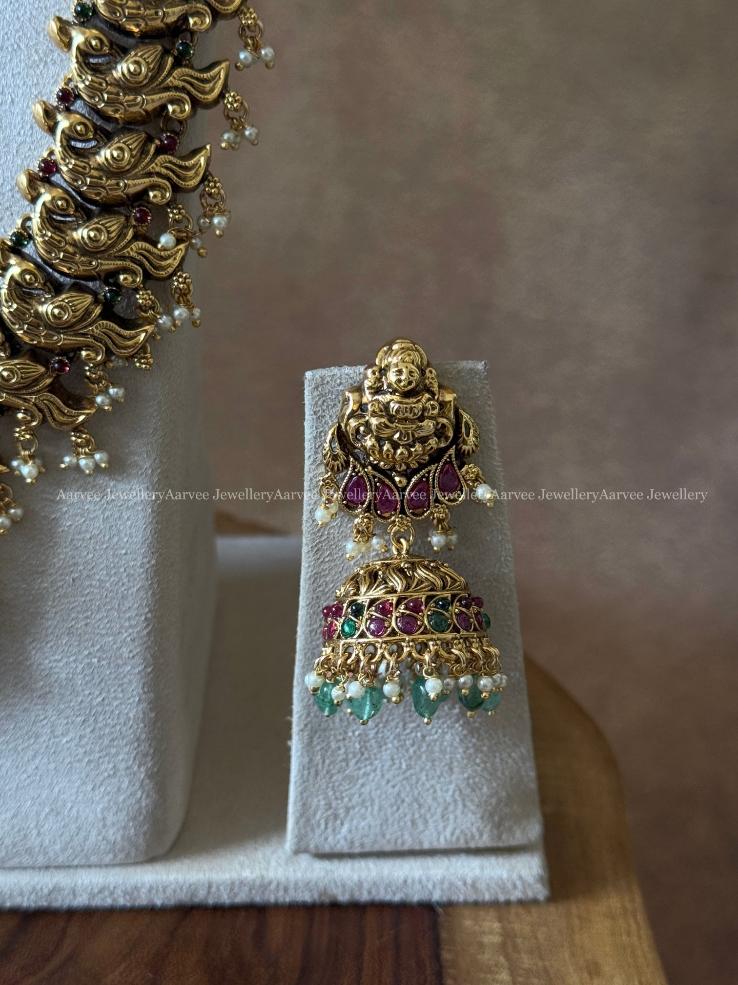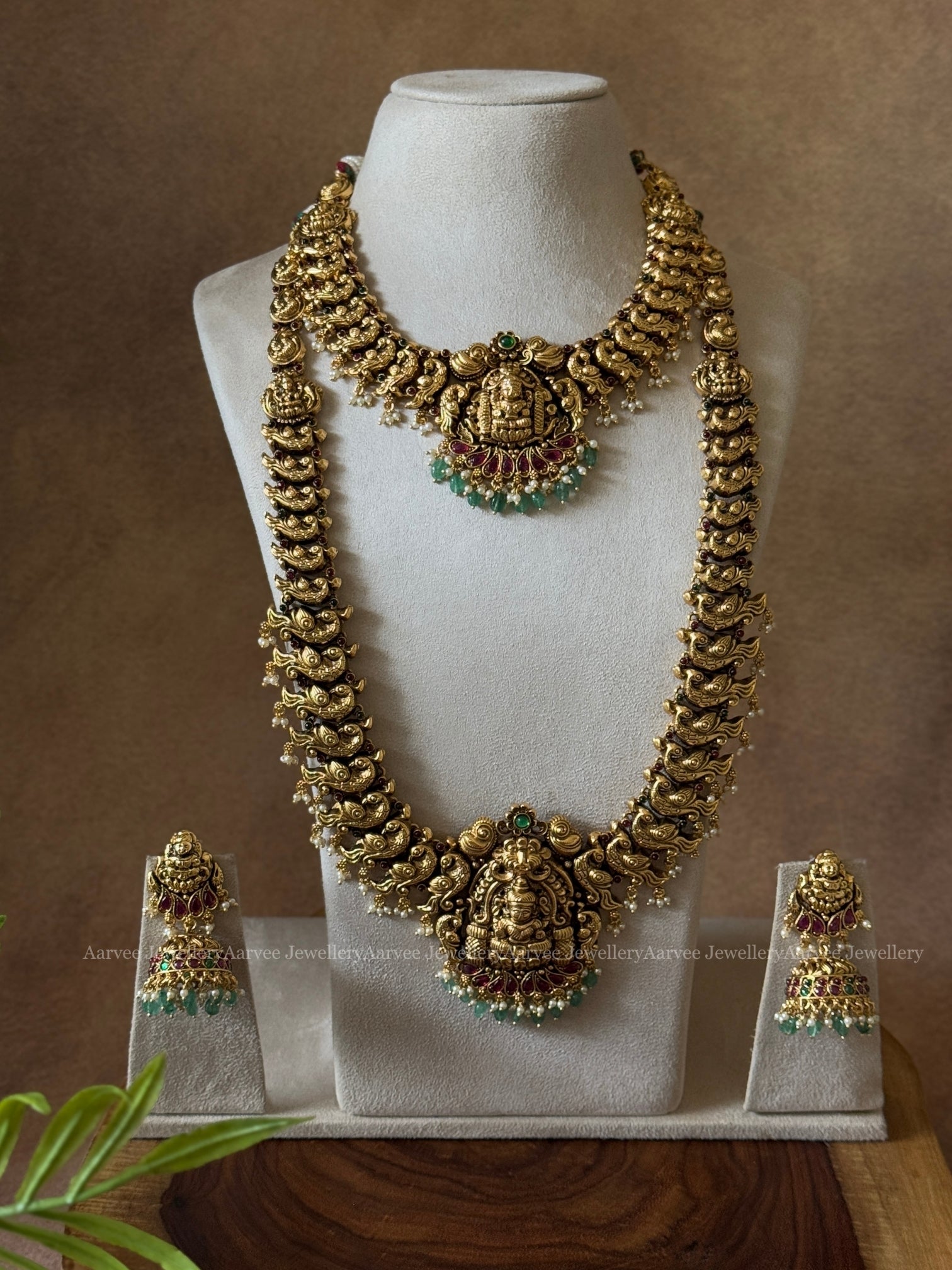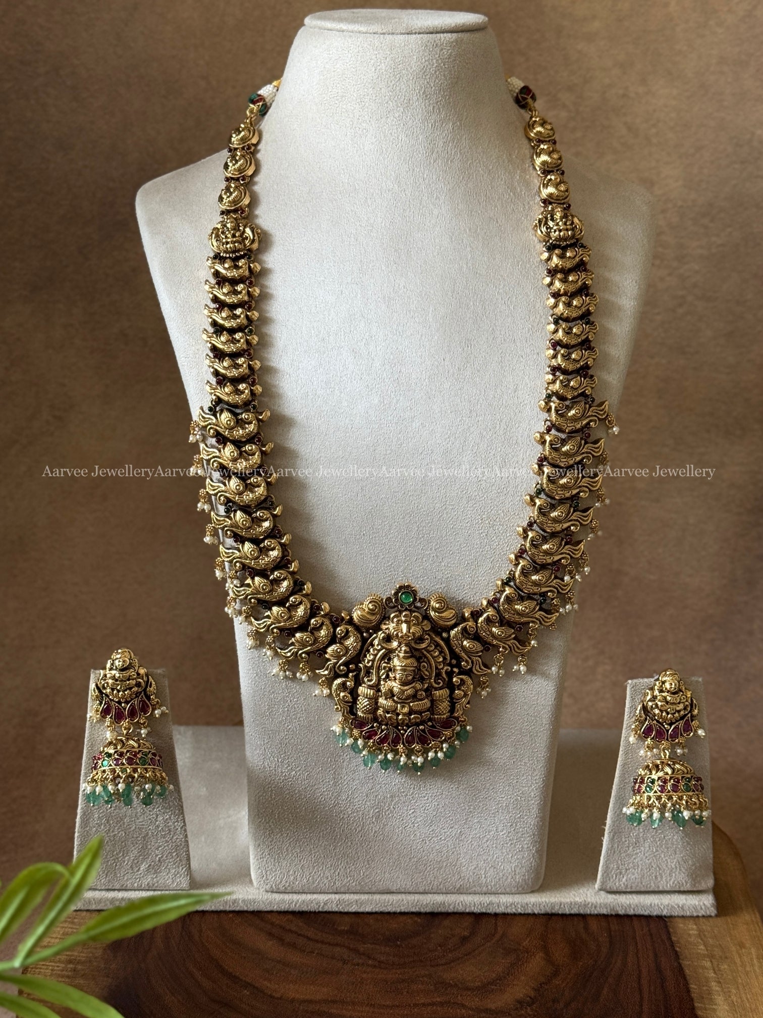 TEMPLE BRIDAL JEWELLERY SET WITH PEACOCK MOTIF & LAKSHMI PENDANT WITH PASTEL BEADS