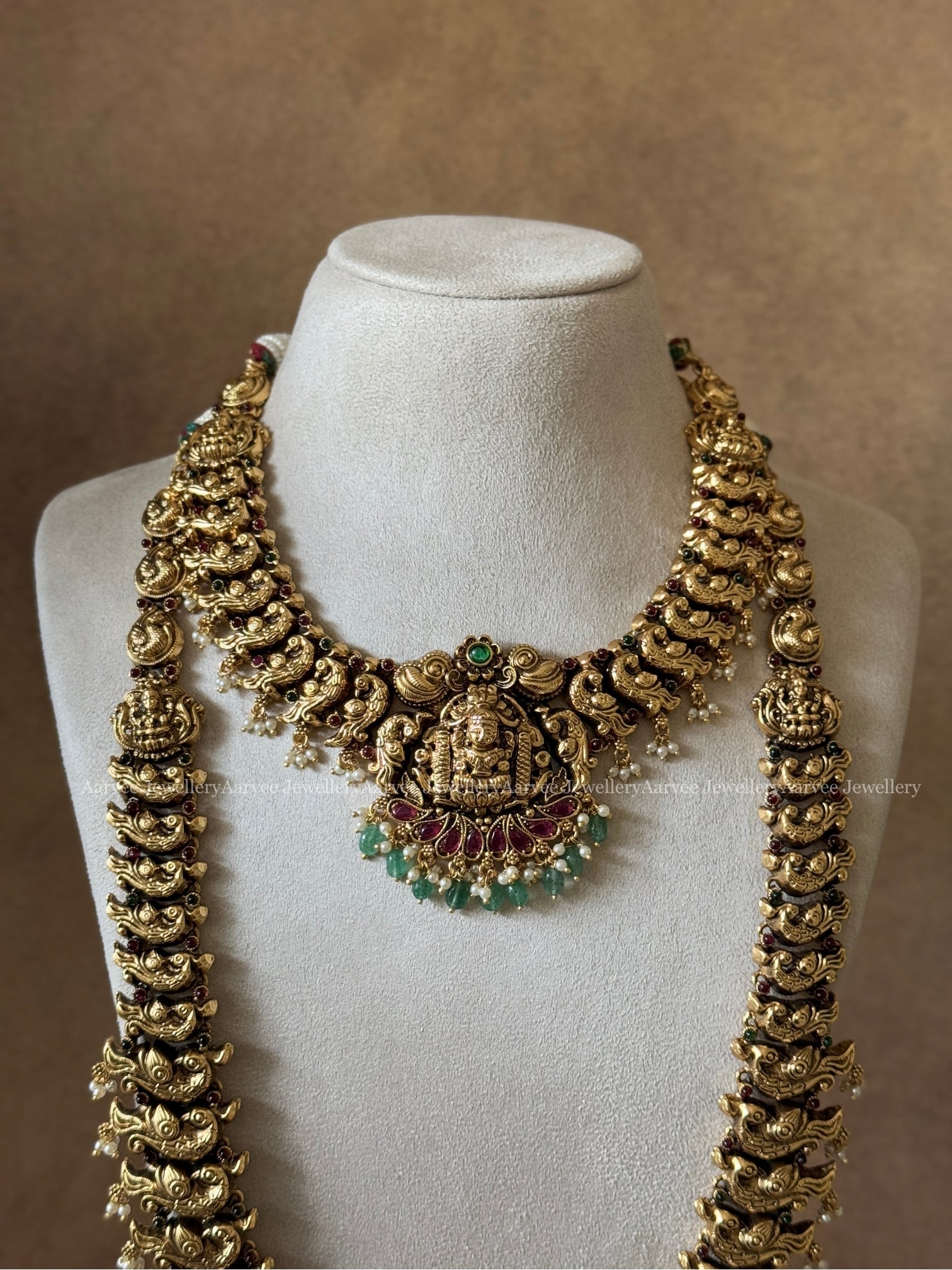 Traditional bridal temple jewellery showcasing a divine Lakshmi pendant and intricate peacock motifs, accented with soft pastel beads