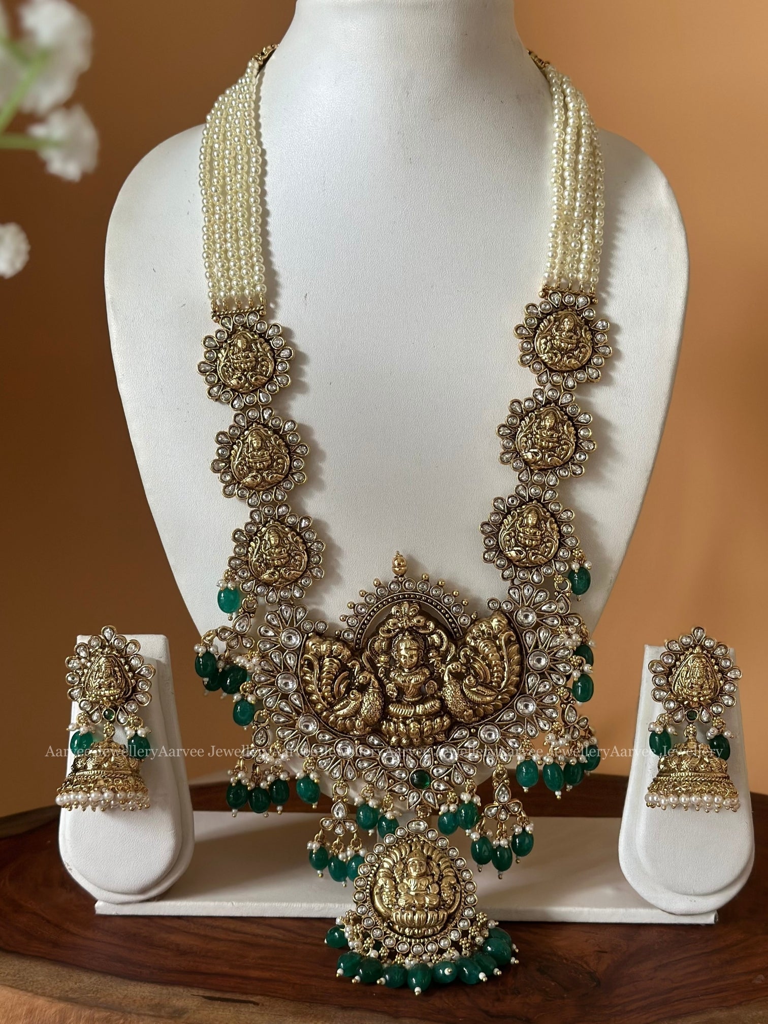 TEMPLE JEWELLERY | PEARL LAKSHMI PENDANT HARAM SET WITH GREEN BEADS
