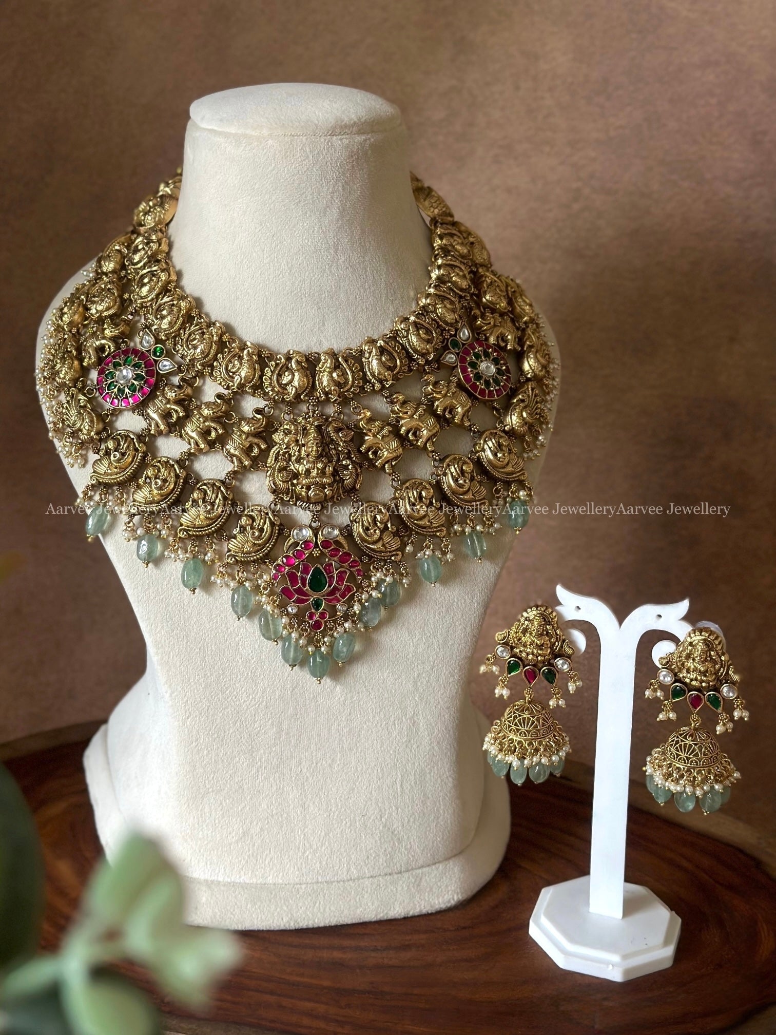 Traditional temple jewellery set with intricate Nakshi work, pastel-toned beads, and a bold three-layer necklace design.