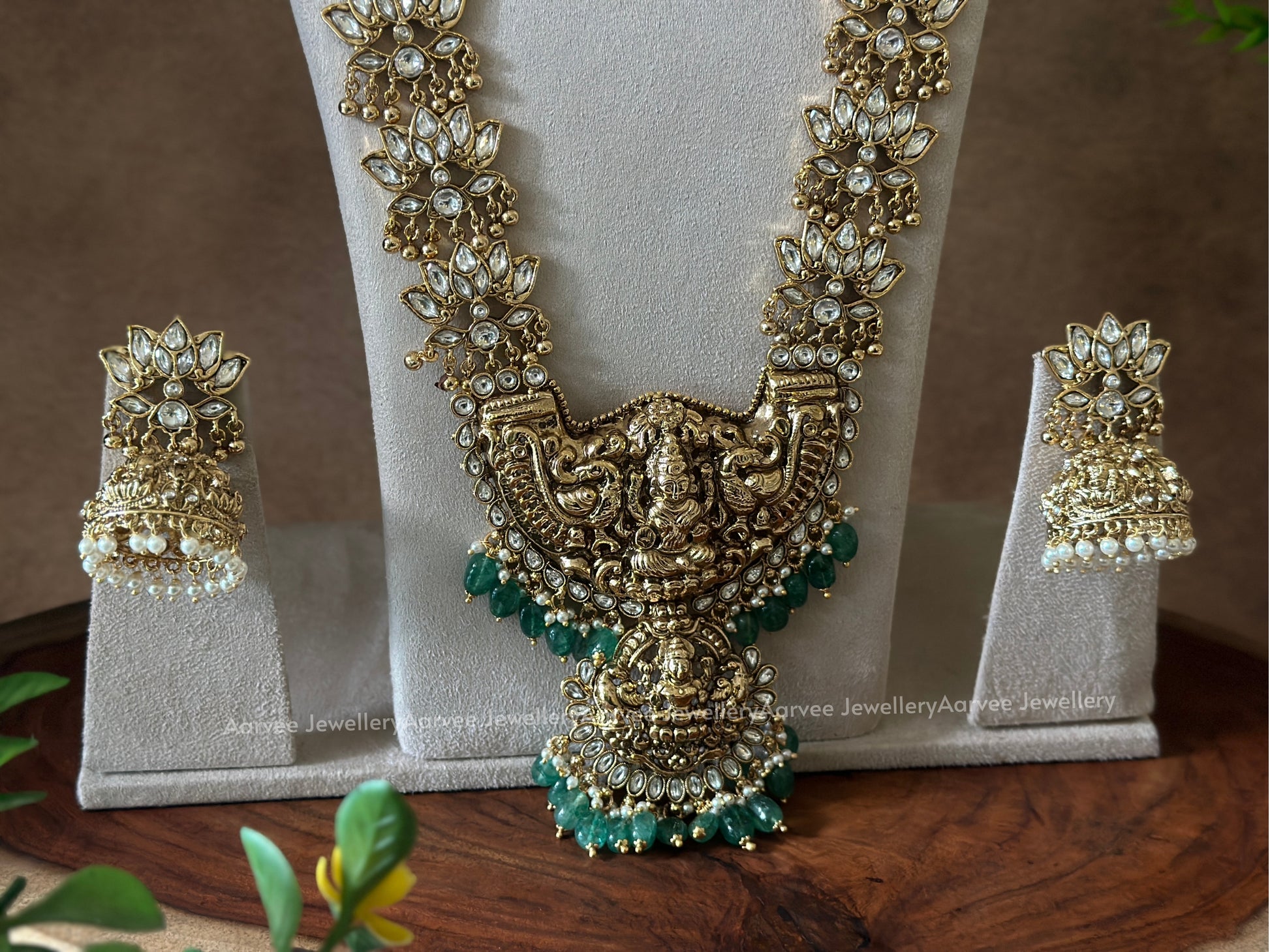 Traditional Temple Set: Lotus Motif Haram with Lakshmi Pendant in White Stones, Complemented by a Multi-Pendant Choker with Pastel Bead Detailing