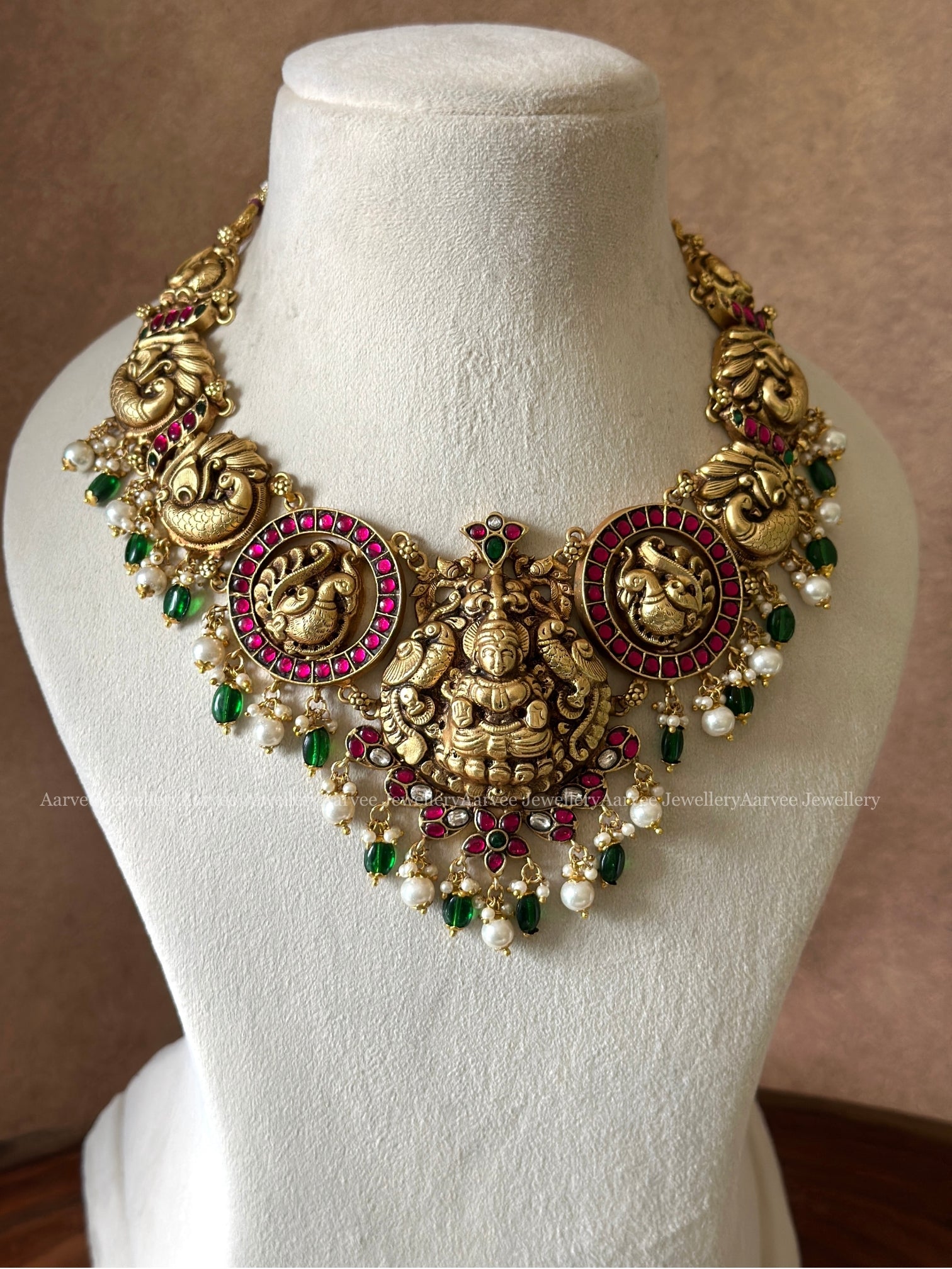 Bold Nagas motif necklace featuring Jadau Kundan elements, accented with pearl and green bead embellishments
