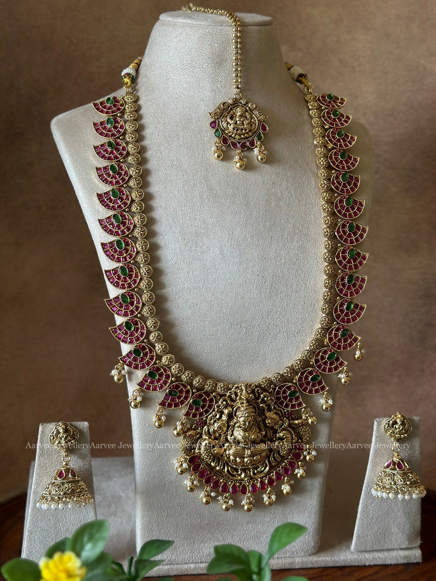 This stunning temple-style haram features a beautifully detailed Lakshmi pendant, adorned with ruby and green stone embellishments. Its traditional design adds a divine touch, making it perfect for weddings, festivals, and special occasions.