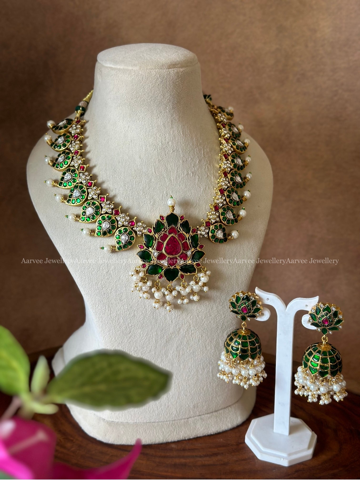 TRADITIONAL JADAU KUNDAN GREEN STONE MANGO MOTIF NECKLACE WITH LOTUS PENDANT PAIRED WITH LOTUS JHUMKI