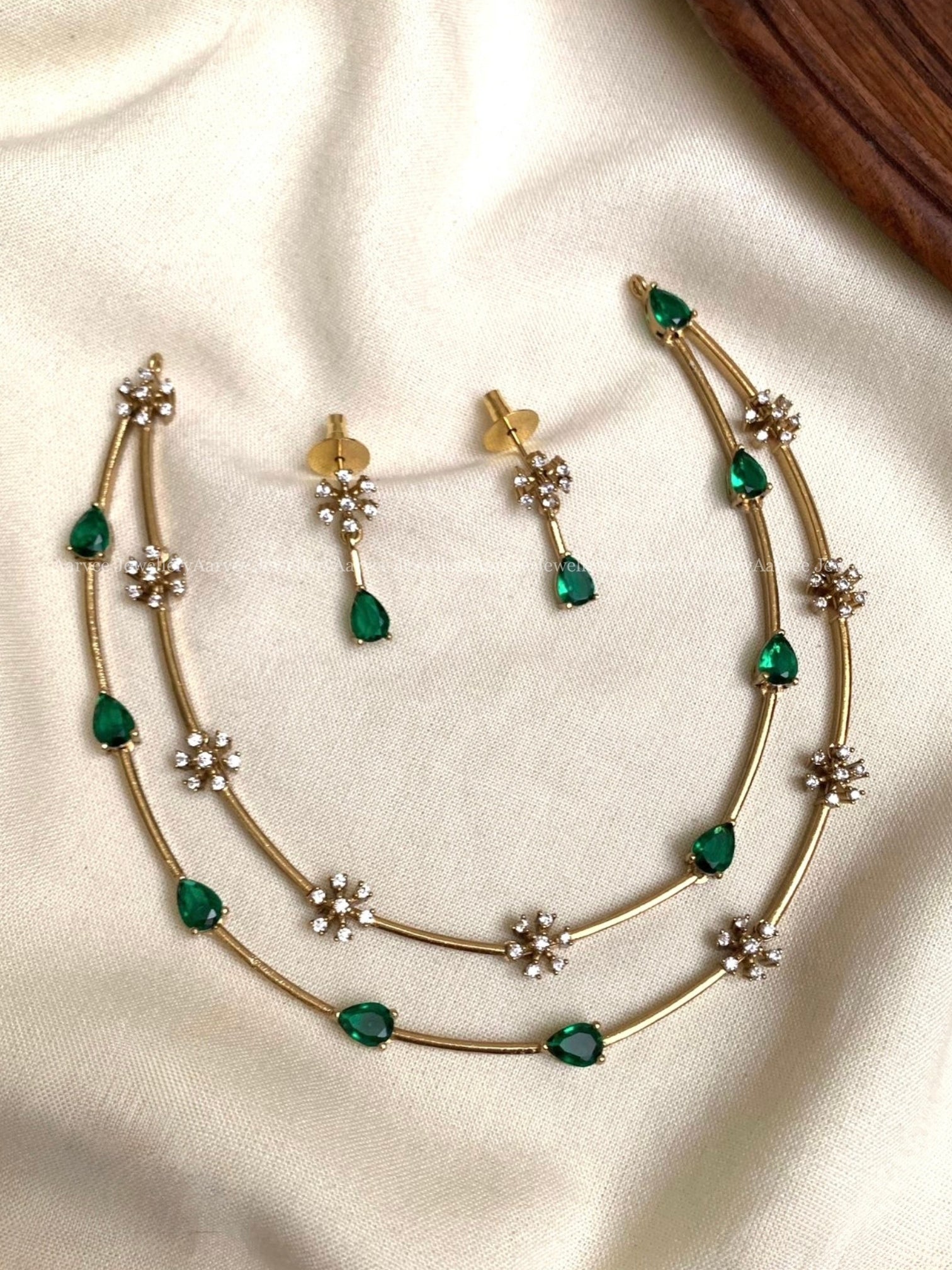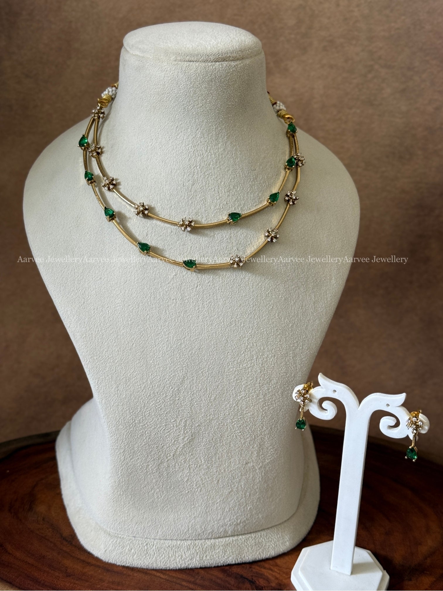 TWO LAYERED HASLI NECKLACE SET WITH GREEN STONE