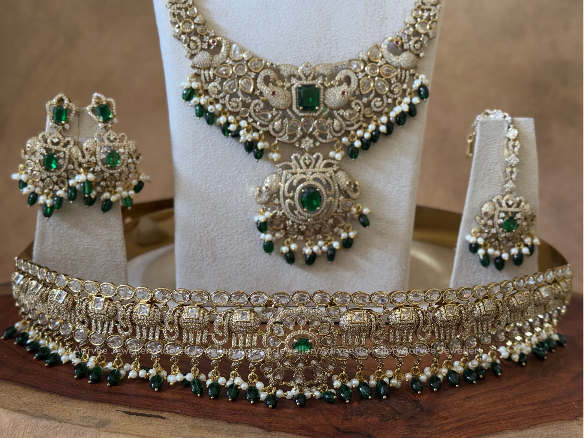 The set Contains: 1 Necklace, 1 Haram,1 Waist Belt , 1 Tikka and 1 Pair of Earrings.