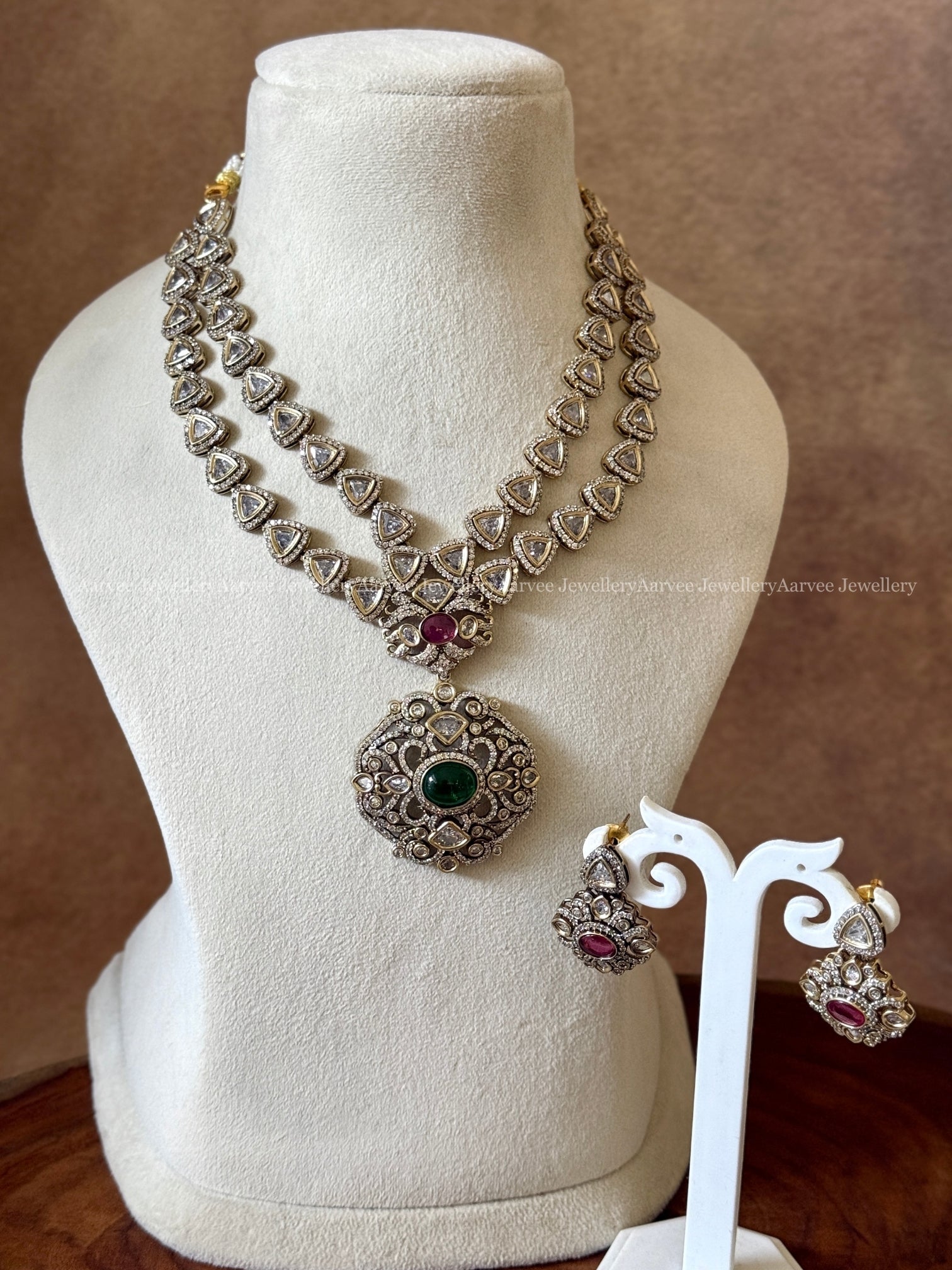 VICTORIAN TWO LAYER NECKLACE SET WITH GREEN/RUBY STONES