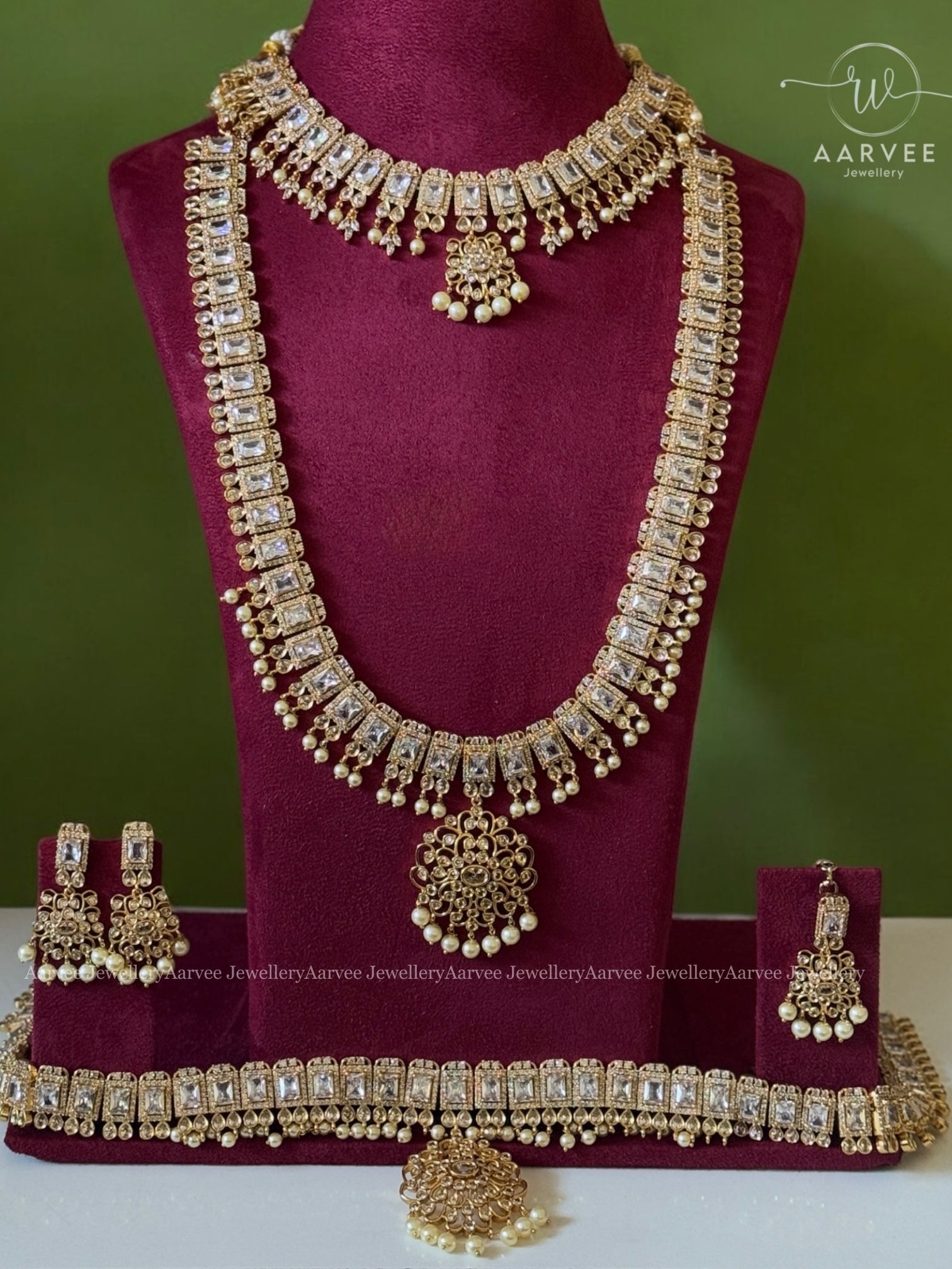 The set Contains: Necklace, Haram, Waist Chain, Tikka and One Pair of earrings.