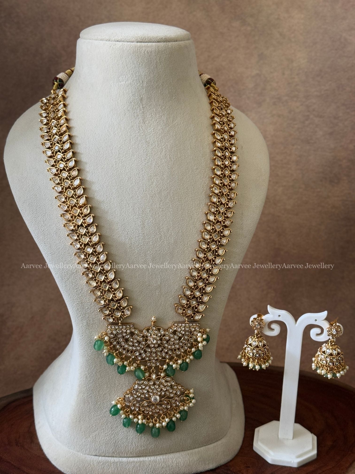 WHITE KUNDAN STONE HARAM SET WITH NON IDOL PENDANT AND PASTEL BEADS