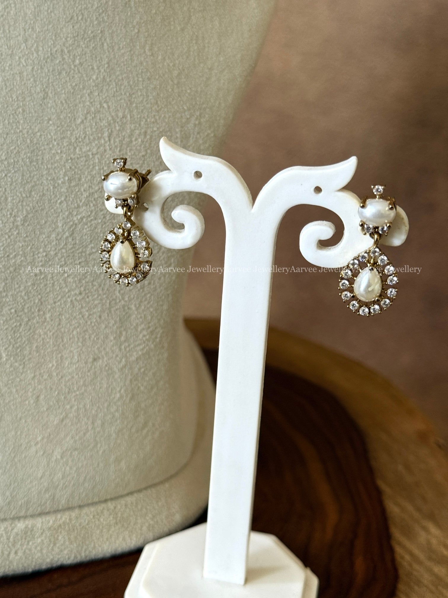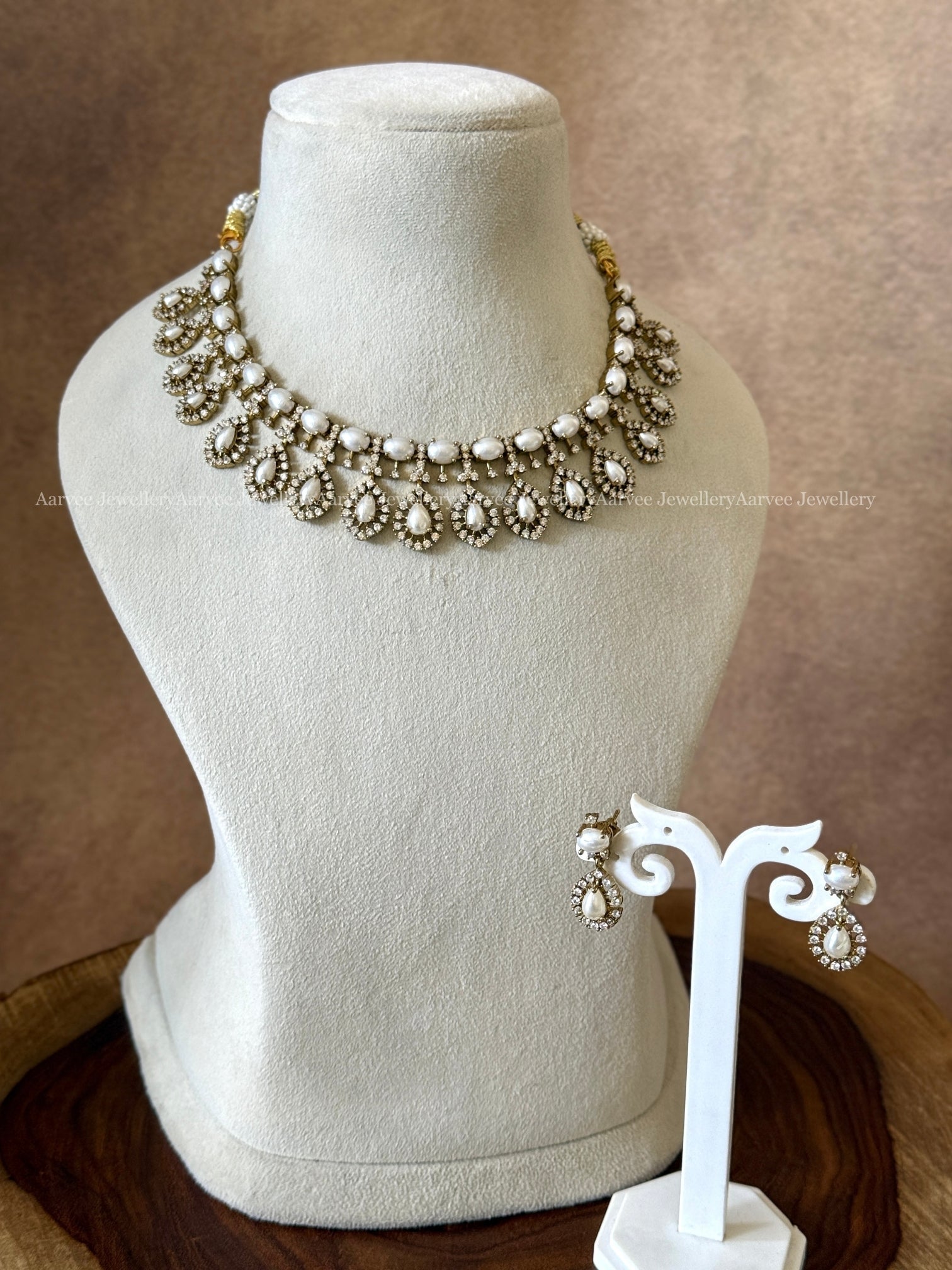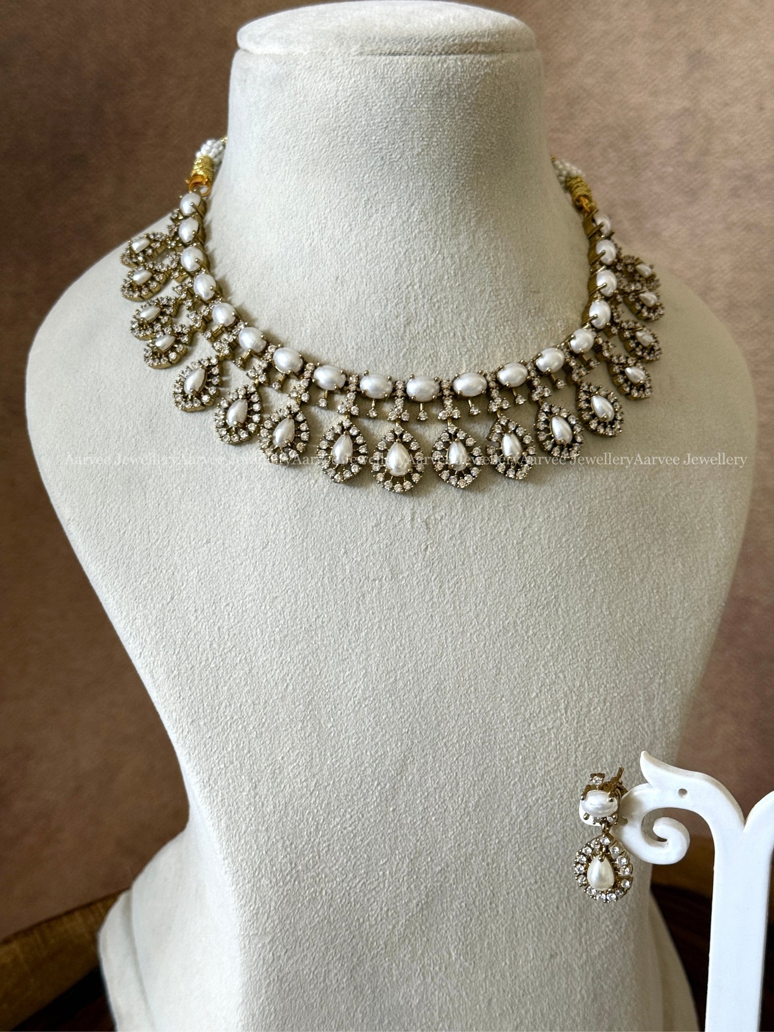 Necklace set crafted with white pearls and a teardrop pendant design