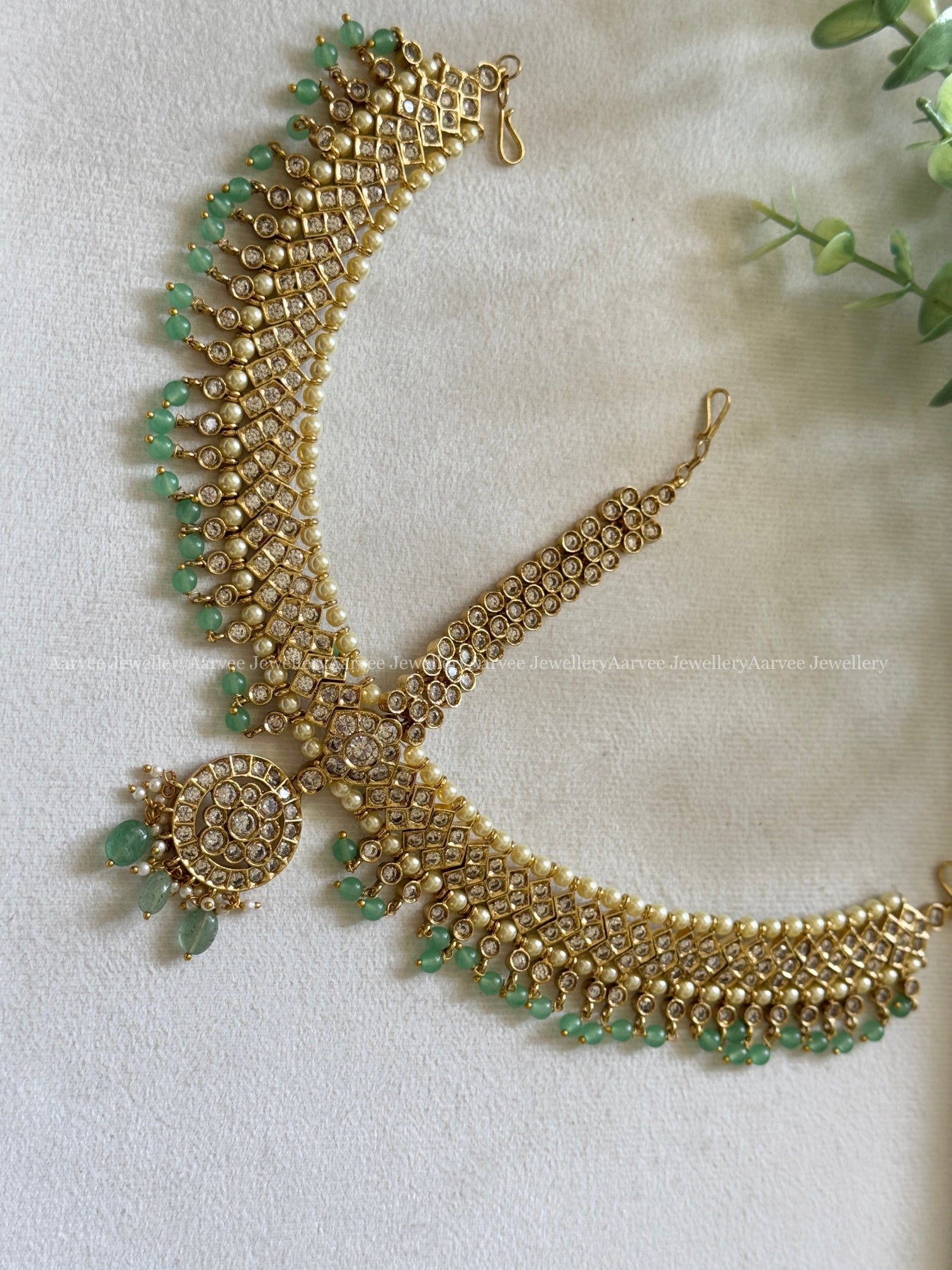 WHITE STONE FLORAL MATHAPATHI WITH PASTAL BEADS